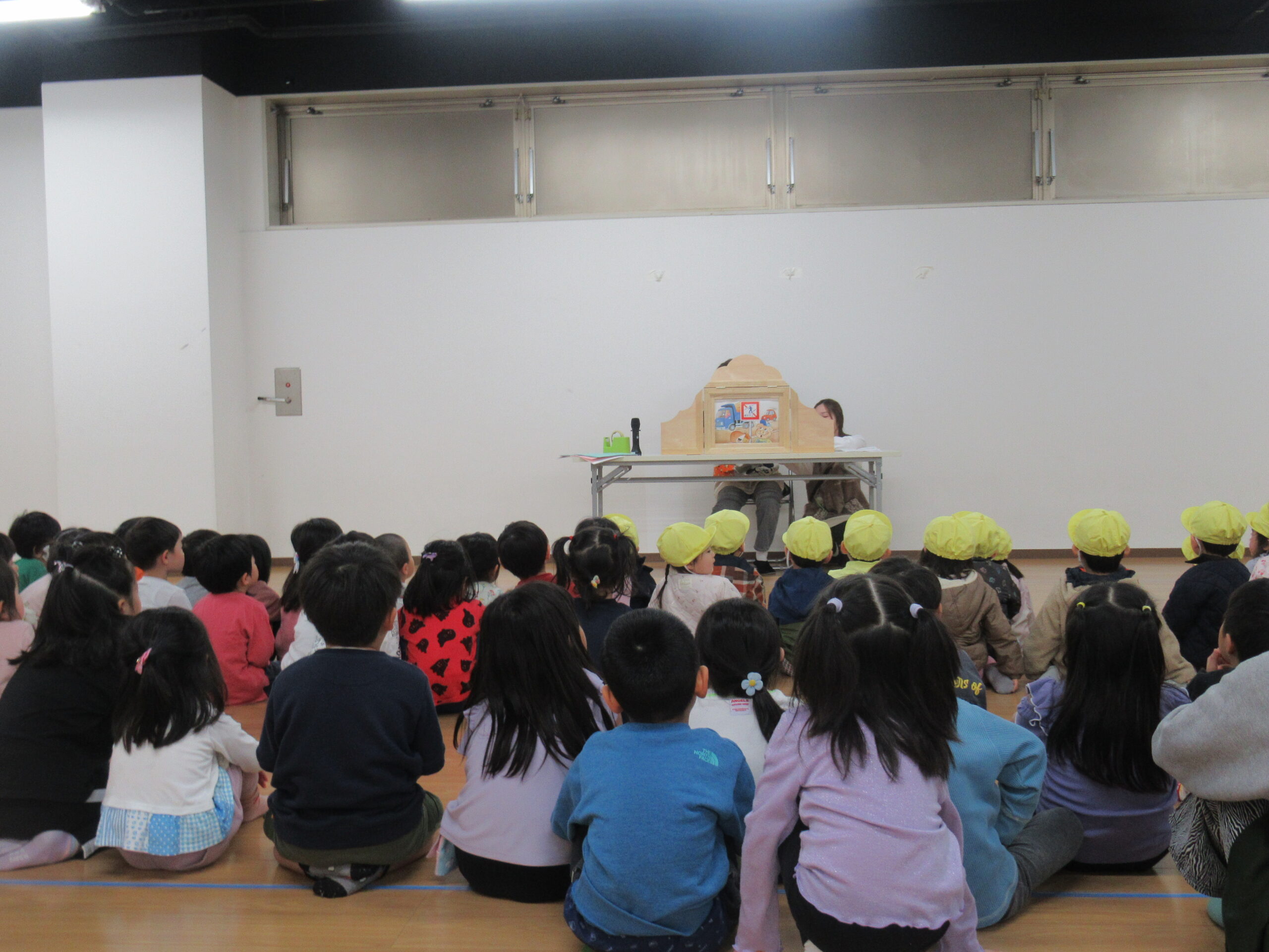 避難訓練後は以上児クラスのみホールにて交通安全教室に参加しました👮