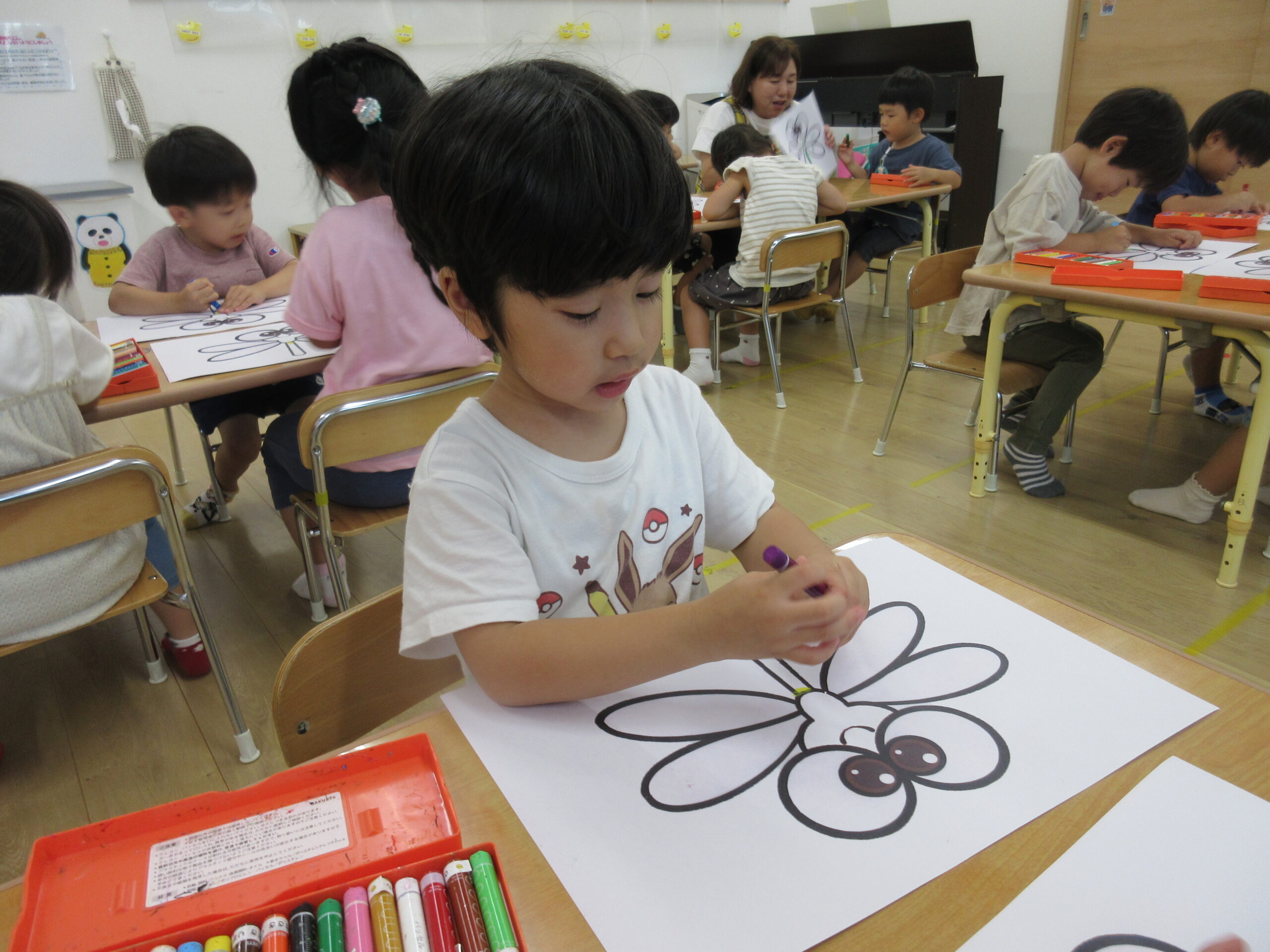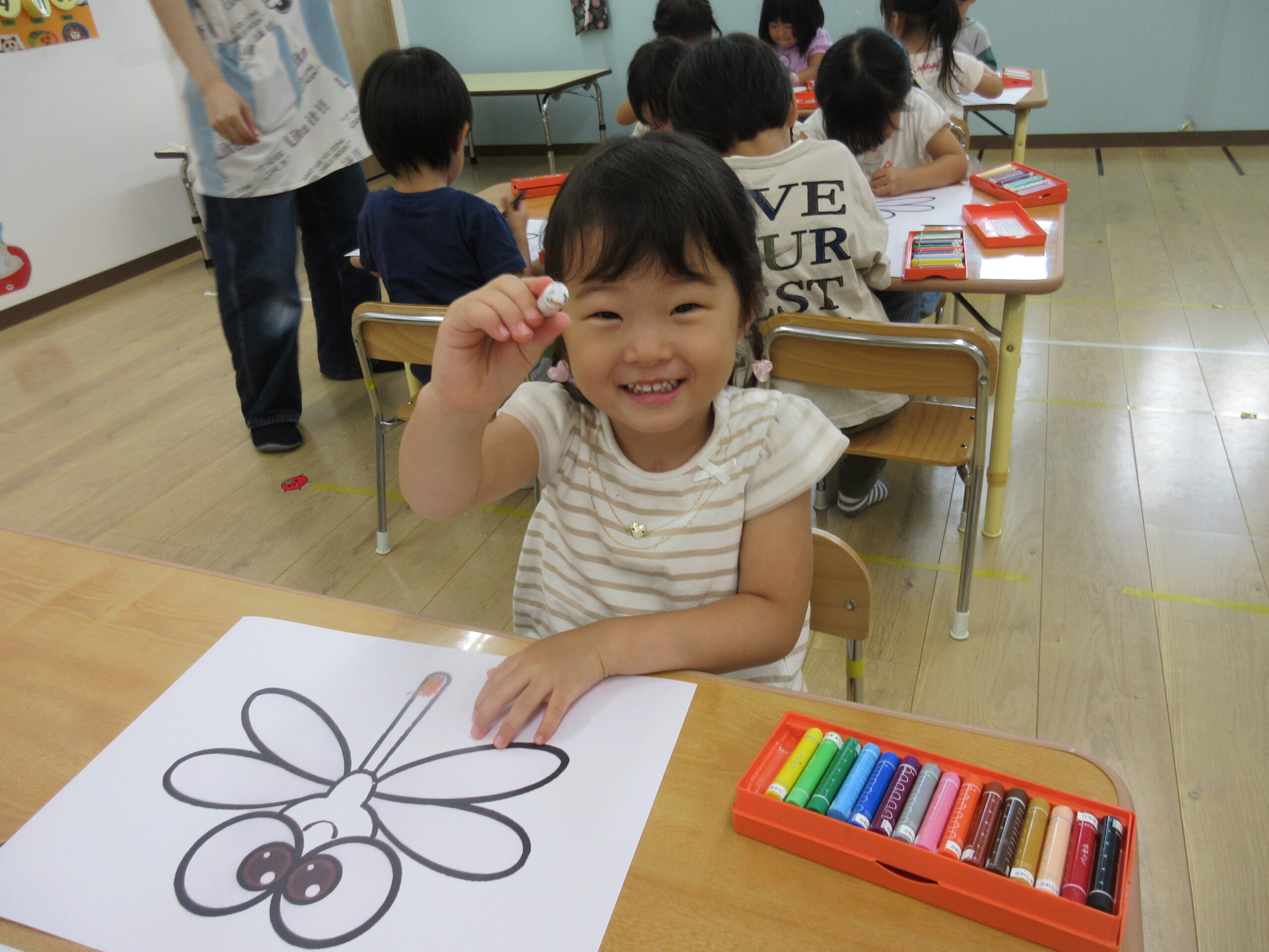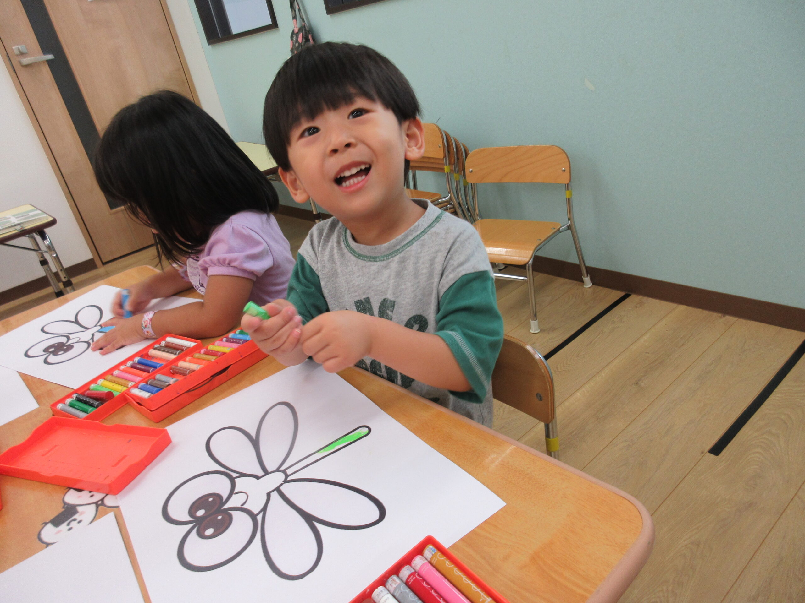 朝夕の風が心地よく感じられる季節になりましたね。外ではトンボが飛び交い、秋の虫の声も聞こえるようになってきました。子どもたちも自然の変化に目を輝かせながら、毎日元気に遊んでいます。 そこでばなな組では、今月のうた「♪トンボのめがね」にちなんで、みんなでトンボの製作をしました。さて、どんなトンボができあがるでしょうか!!