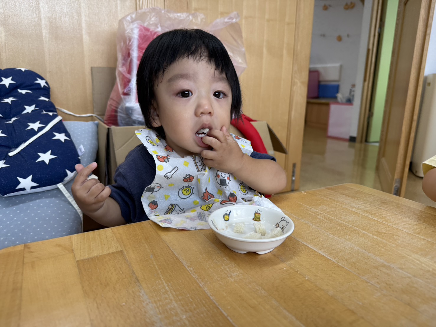 0歳児クラスさんは、つかみ食べに挑戦中です♪
