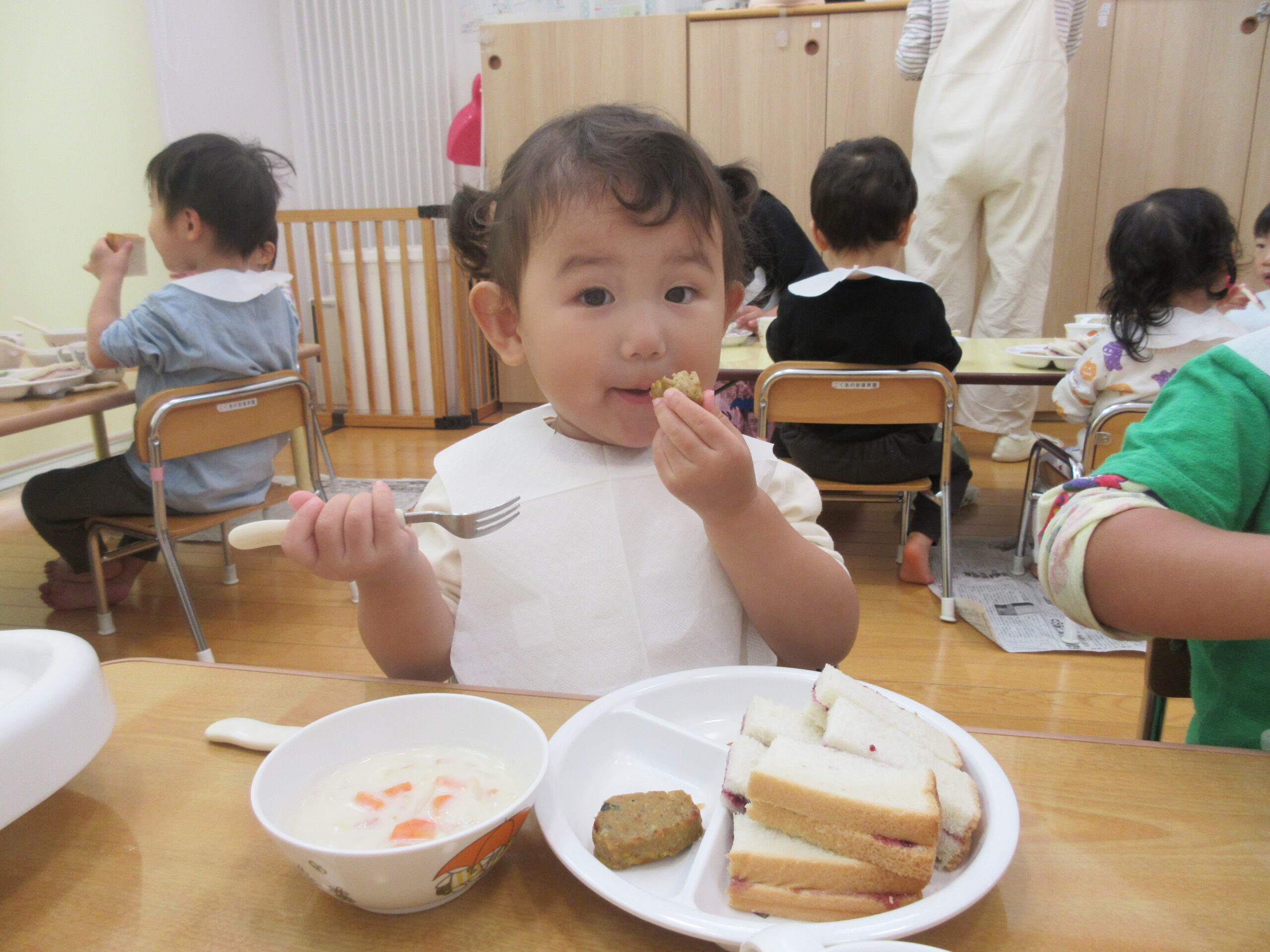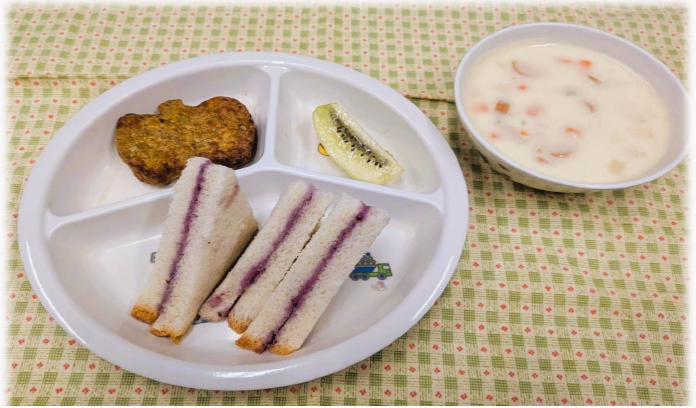 紫色のジャムパンに、かぼちゃの形のハンバーグ、サツマイモのシチューでしたよ👻