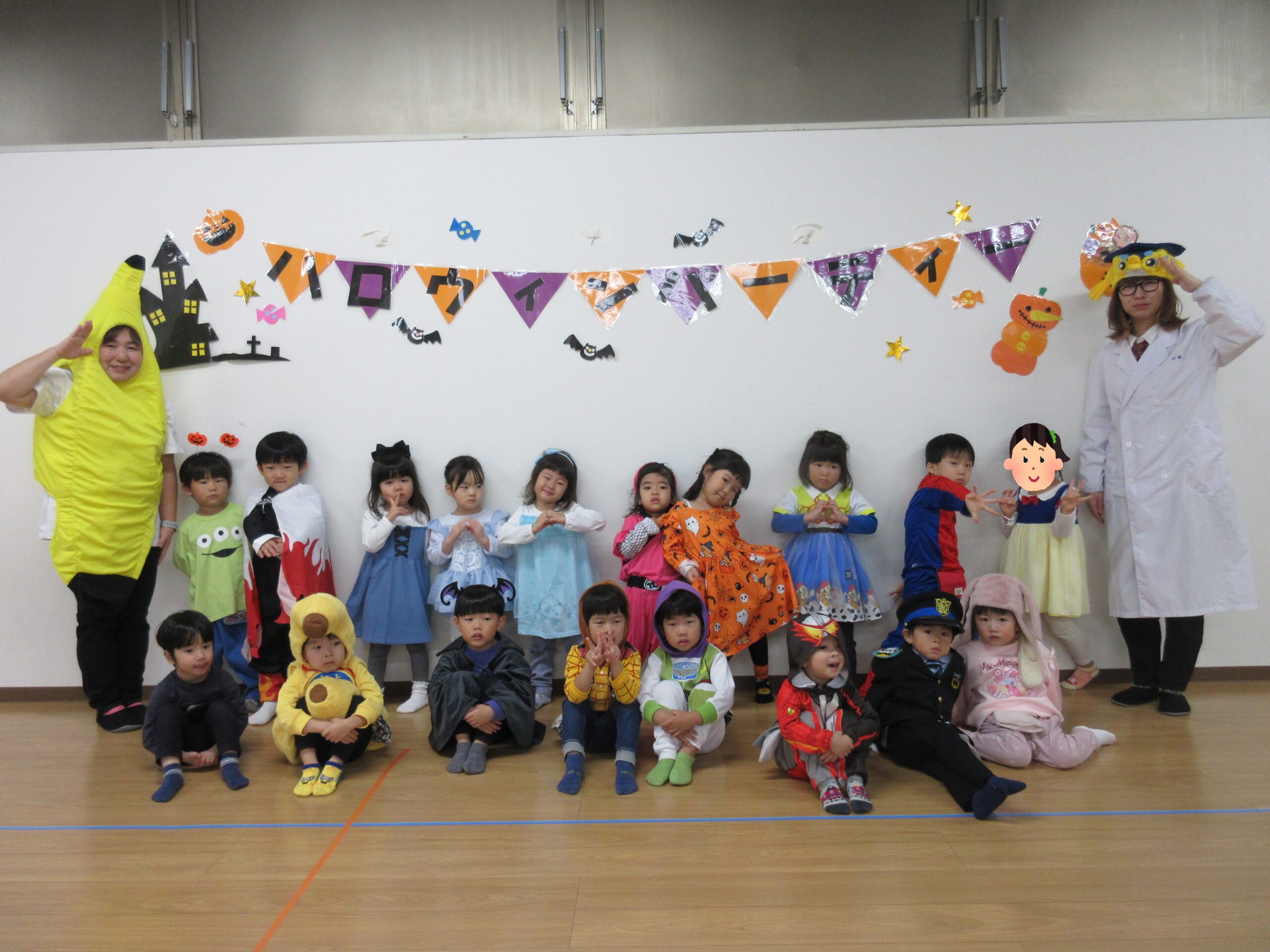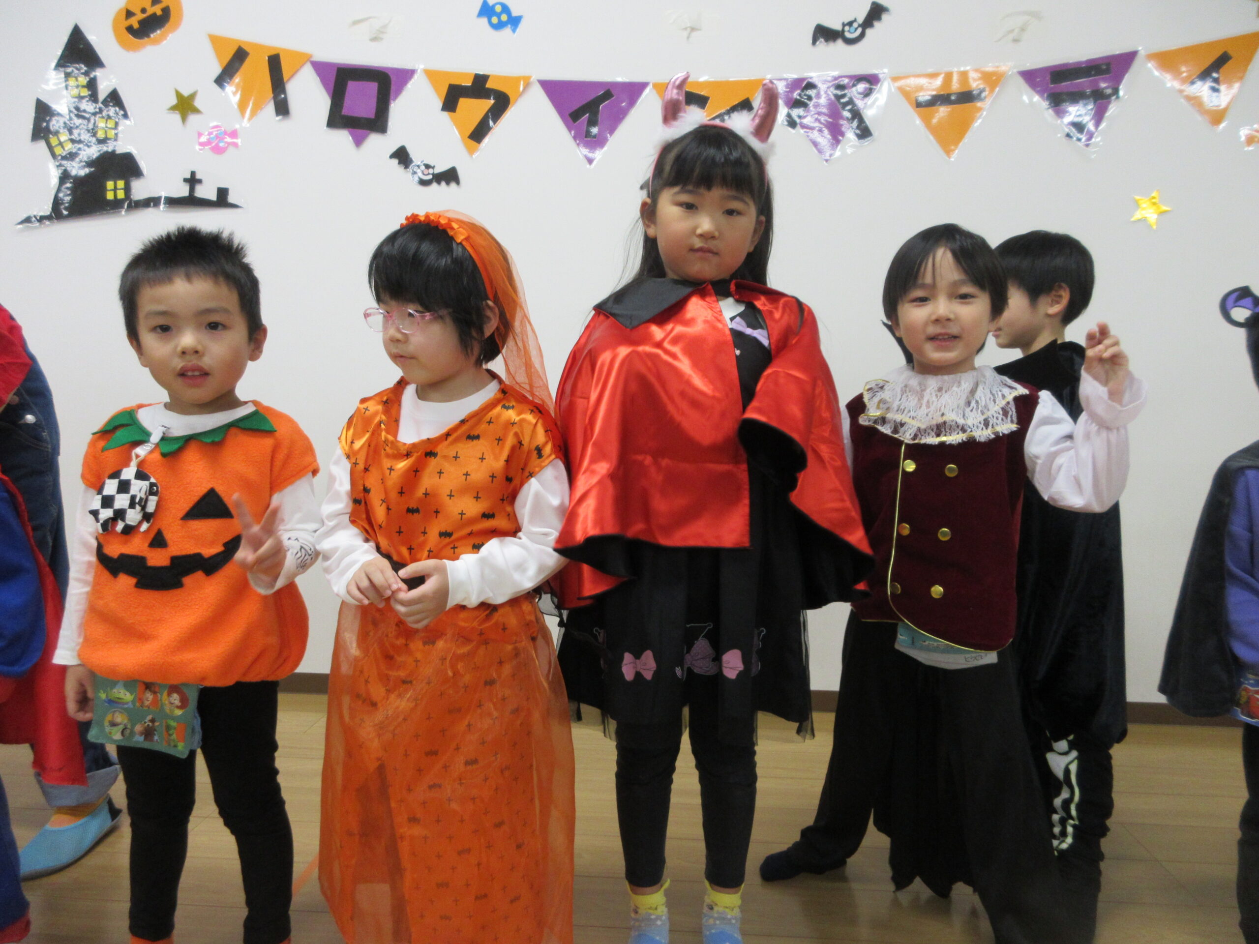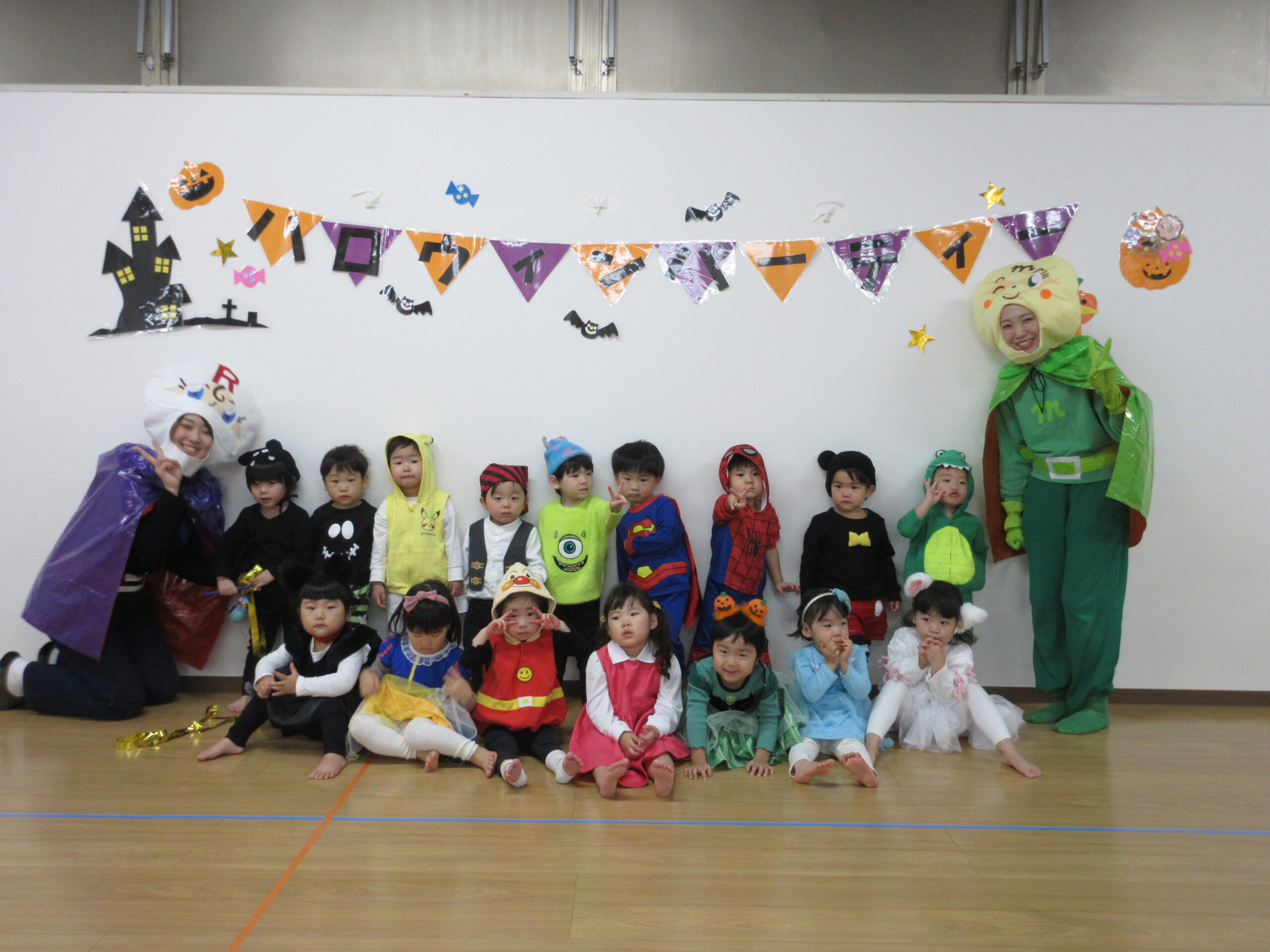 もも・ばなな・ぶどう・めろんぐみさんはホールで、いちご・みかんぐみさんはお部屋でハロウィンパーティーを楽しみます🎃🥳