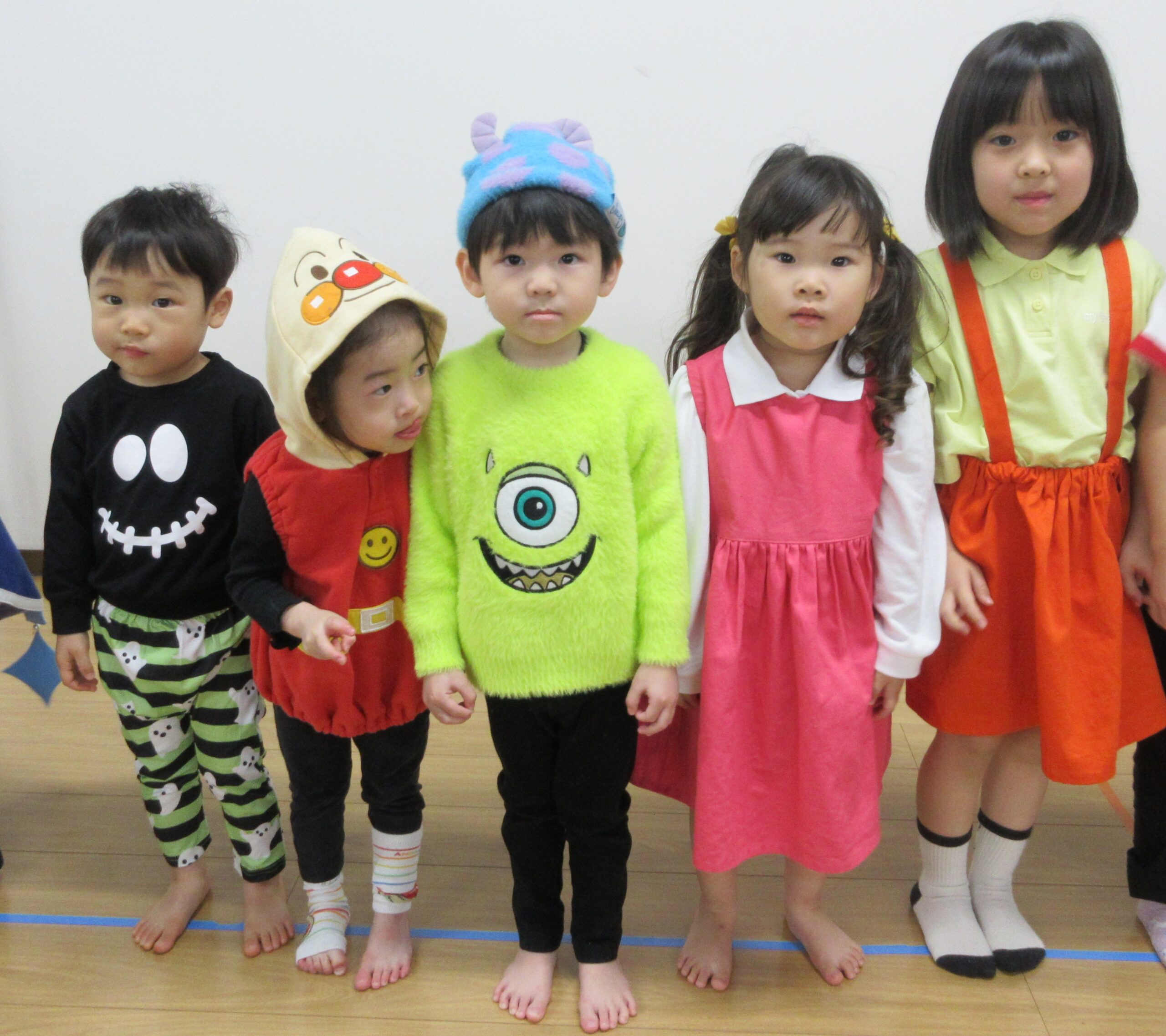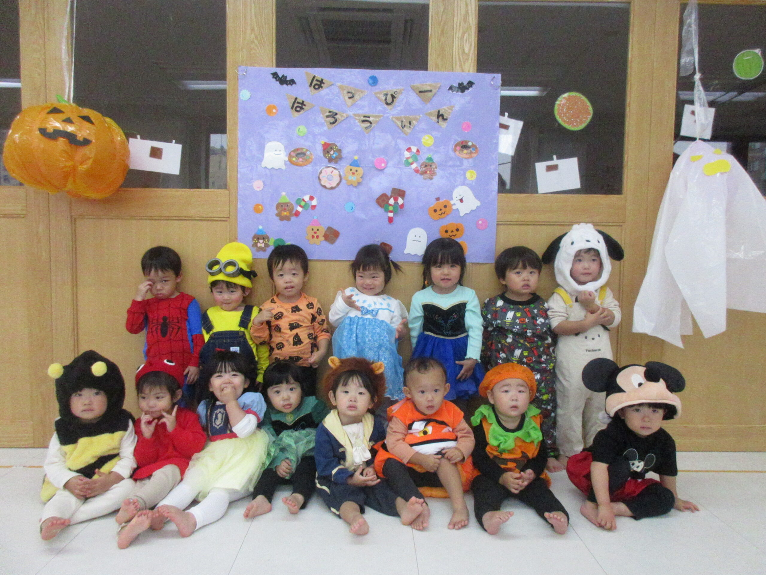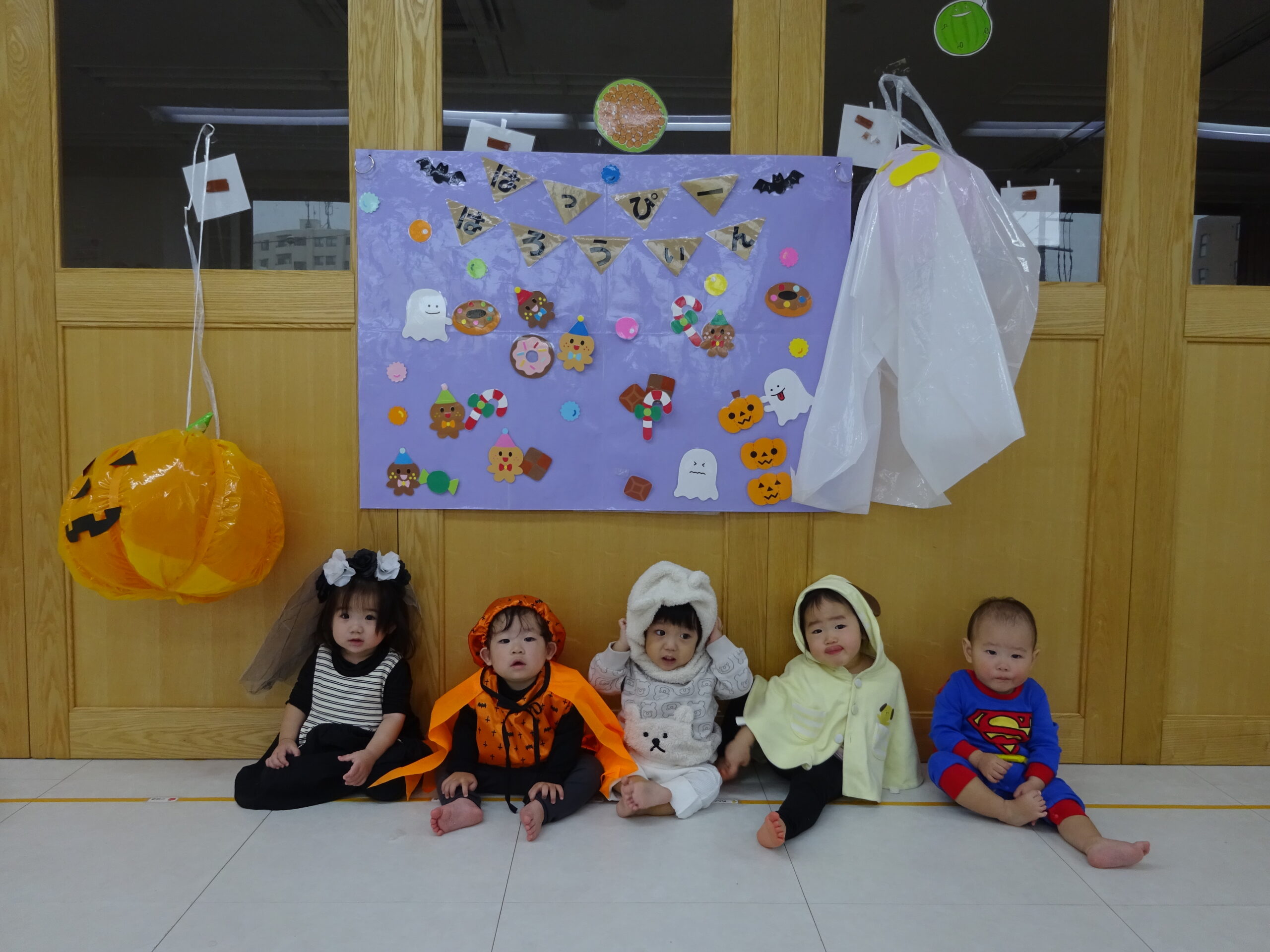 いちご・みかんぐみさんは、お部屋にたくさんの大きなかぼちゃやおばけさんがぶらさがって、大盛り上がり!
