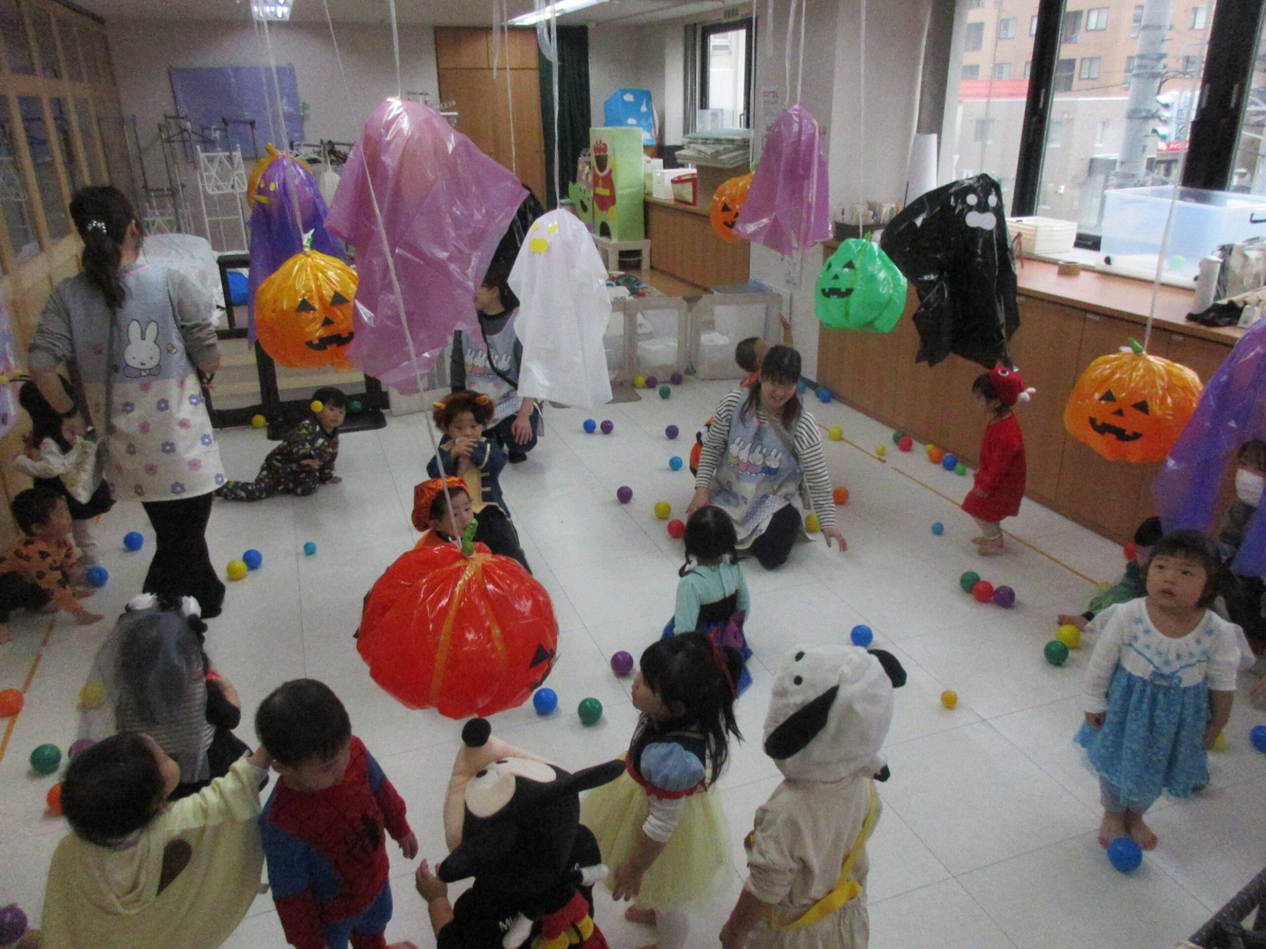みんな「かぼちゃ~!」とアタックしたり、おばけにむかってカラーボールを投げてやっつけたり、楽しみました👻💕