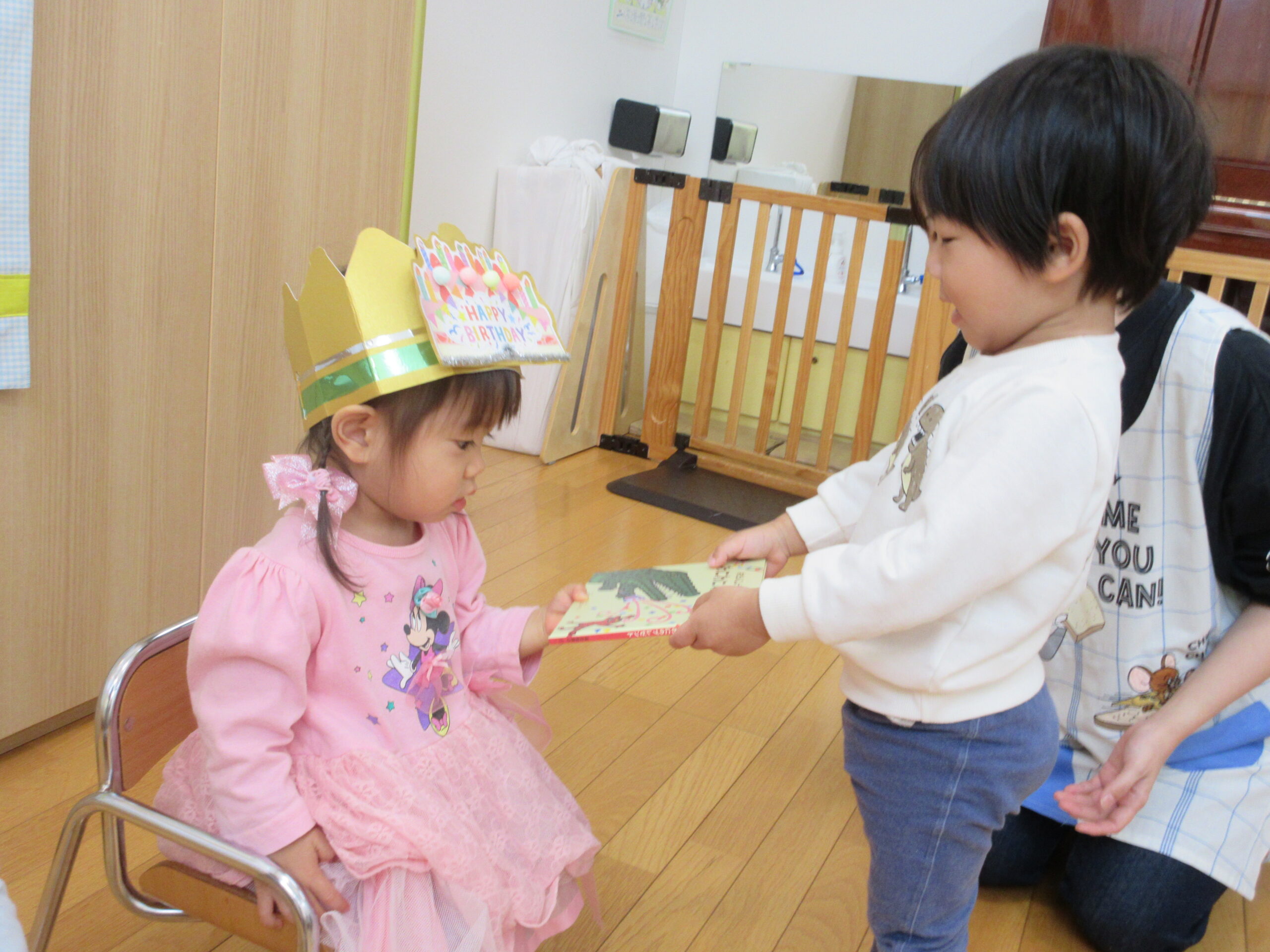 いつも一緒に遊んでいるお友達からのプレゼントの手渡しは、「どうぞ」「ありがとう」のやりとりが心温まる時間です💗