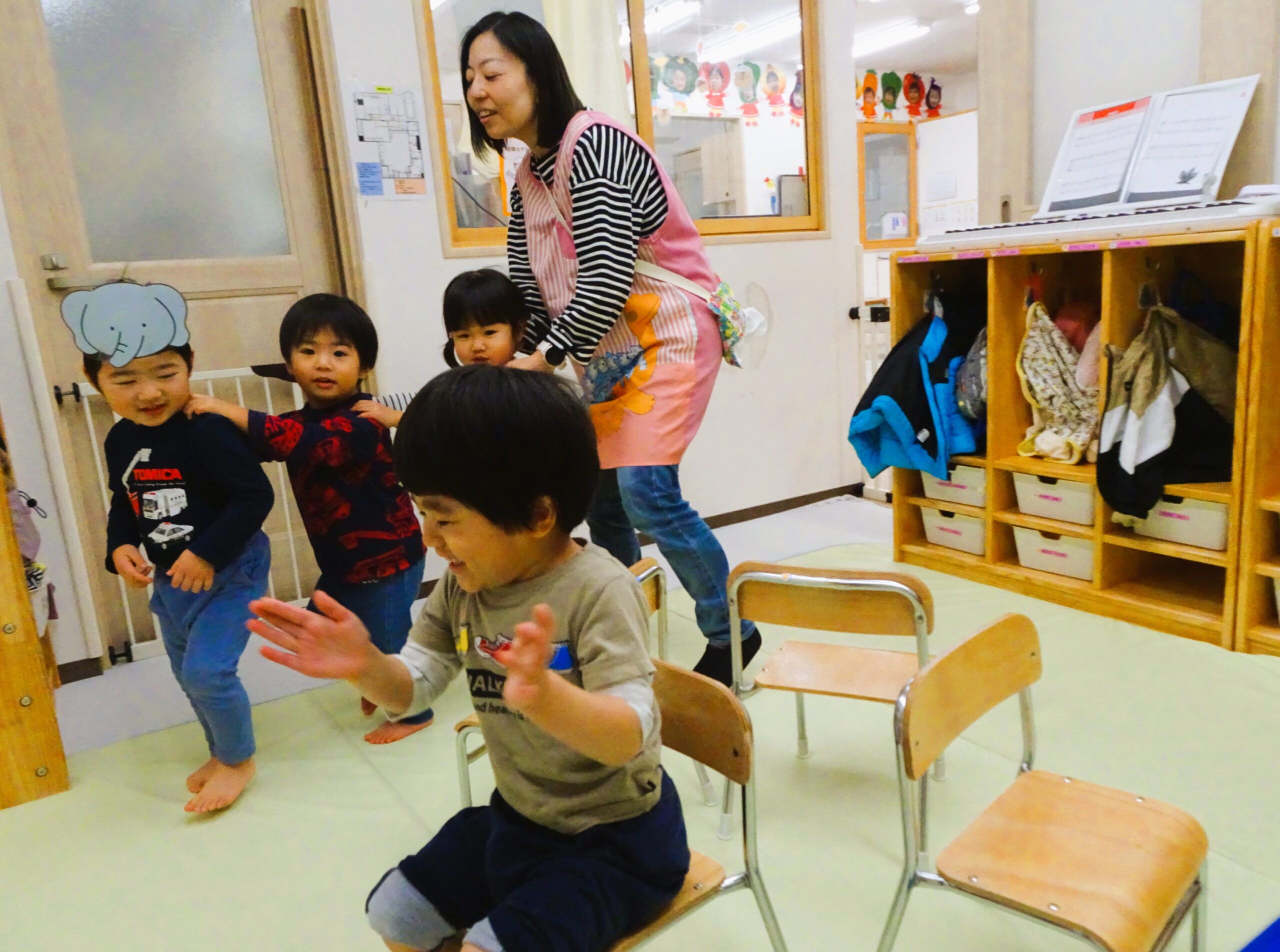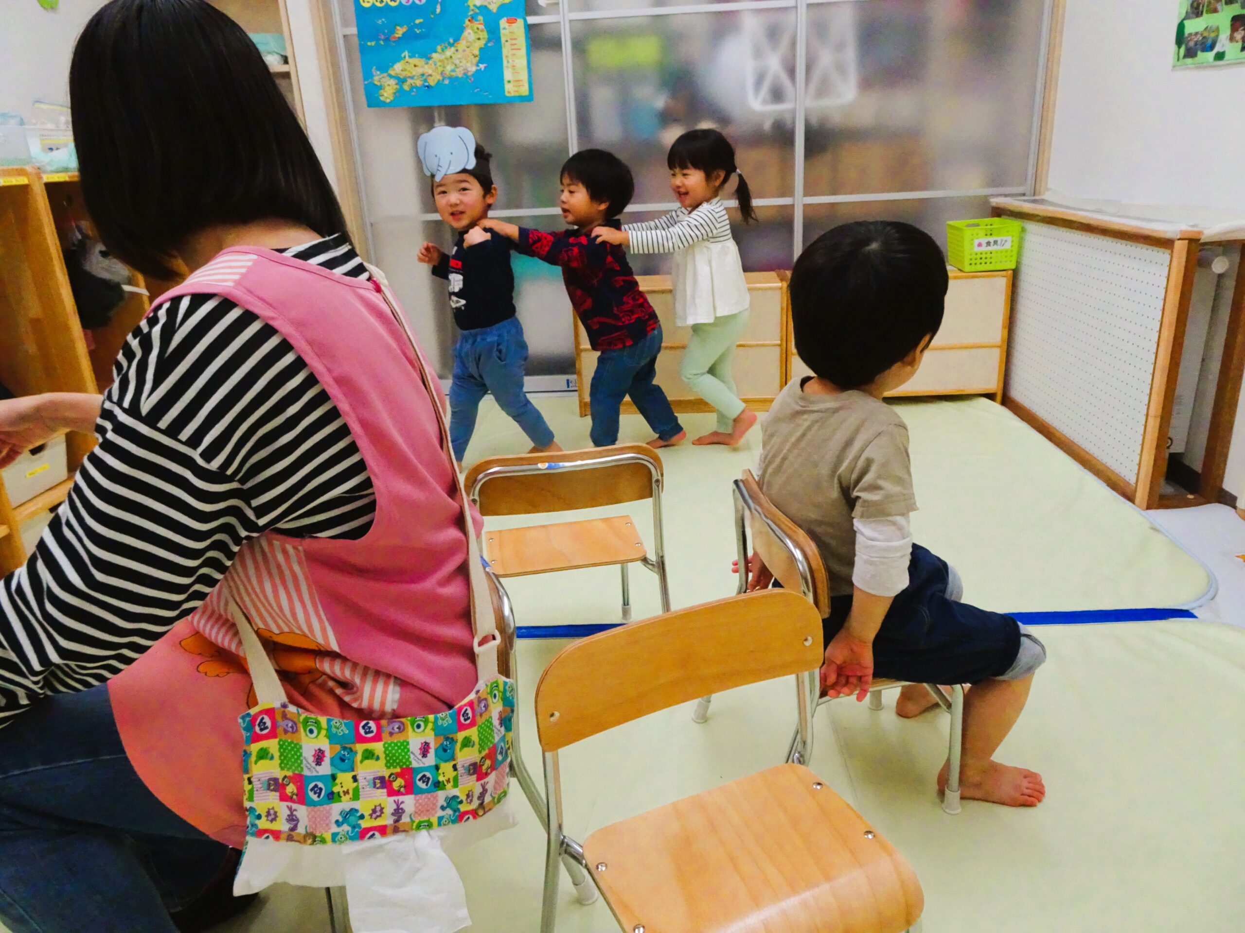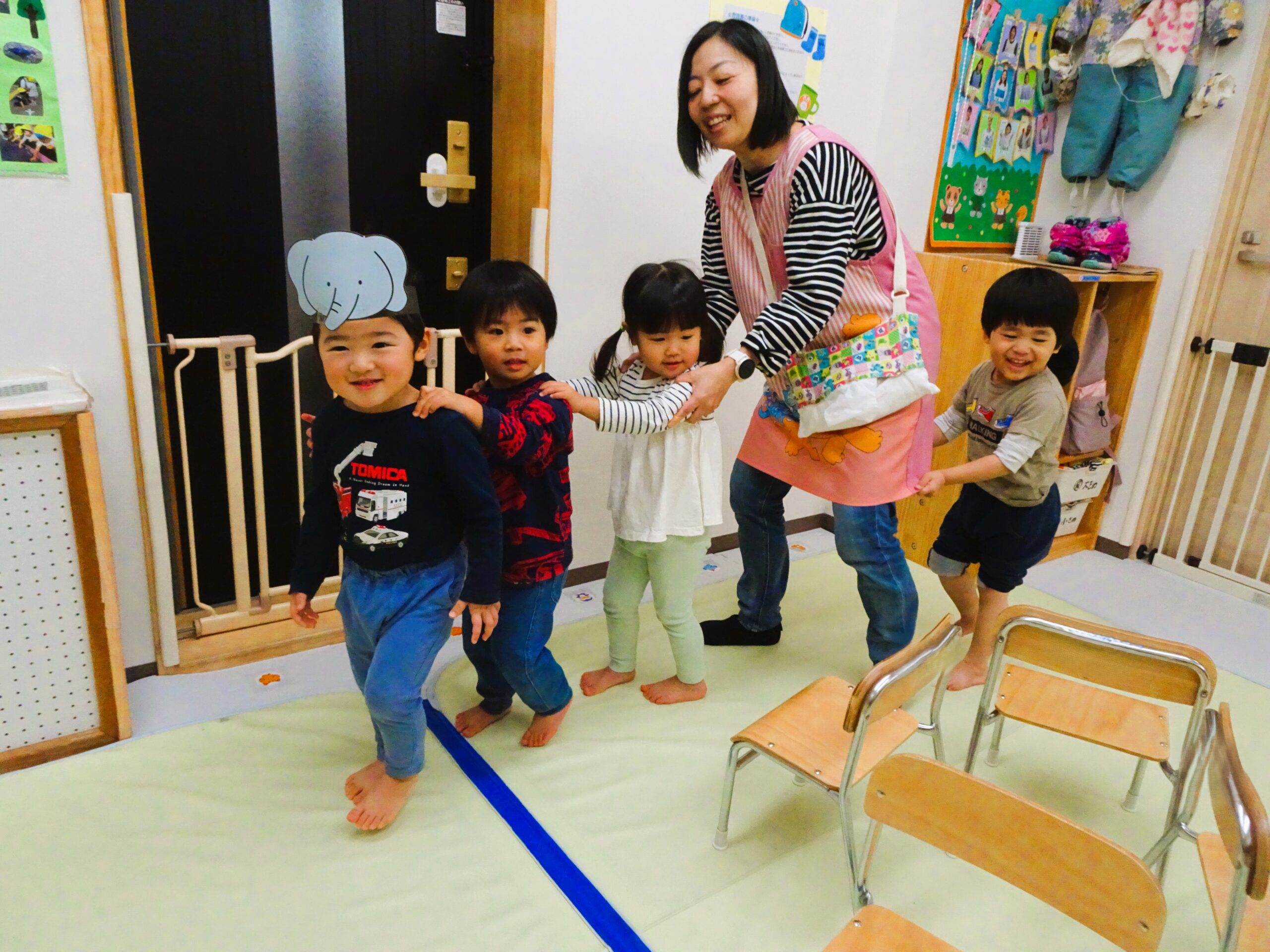ぞうさん役の子が一人ずつお友達を誘って、うしろに繋がっていくこのあそび。