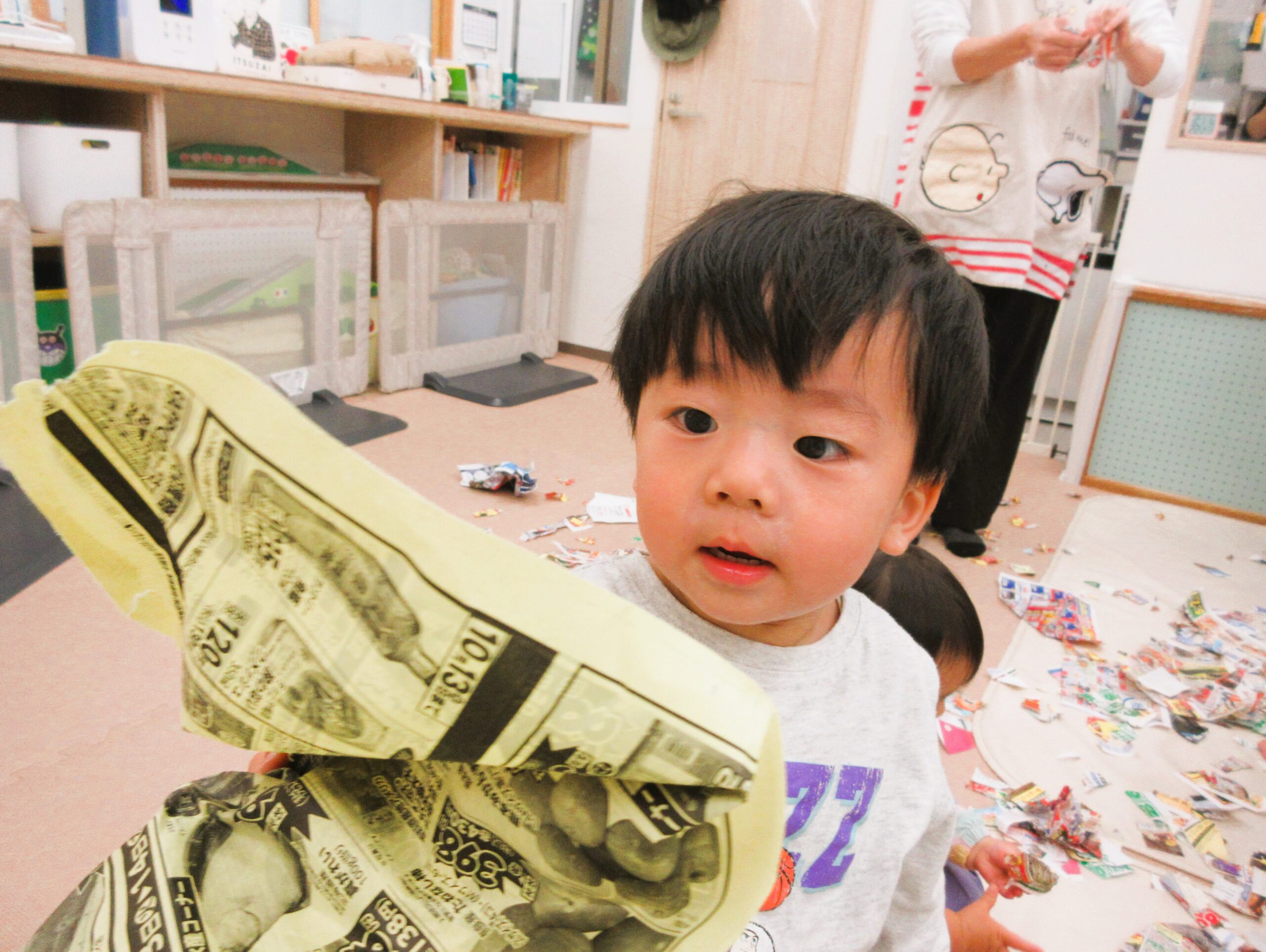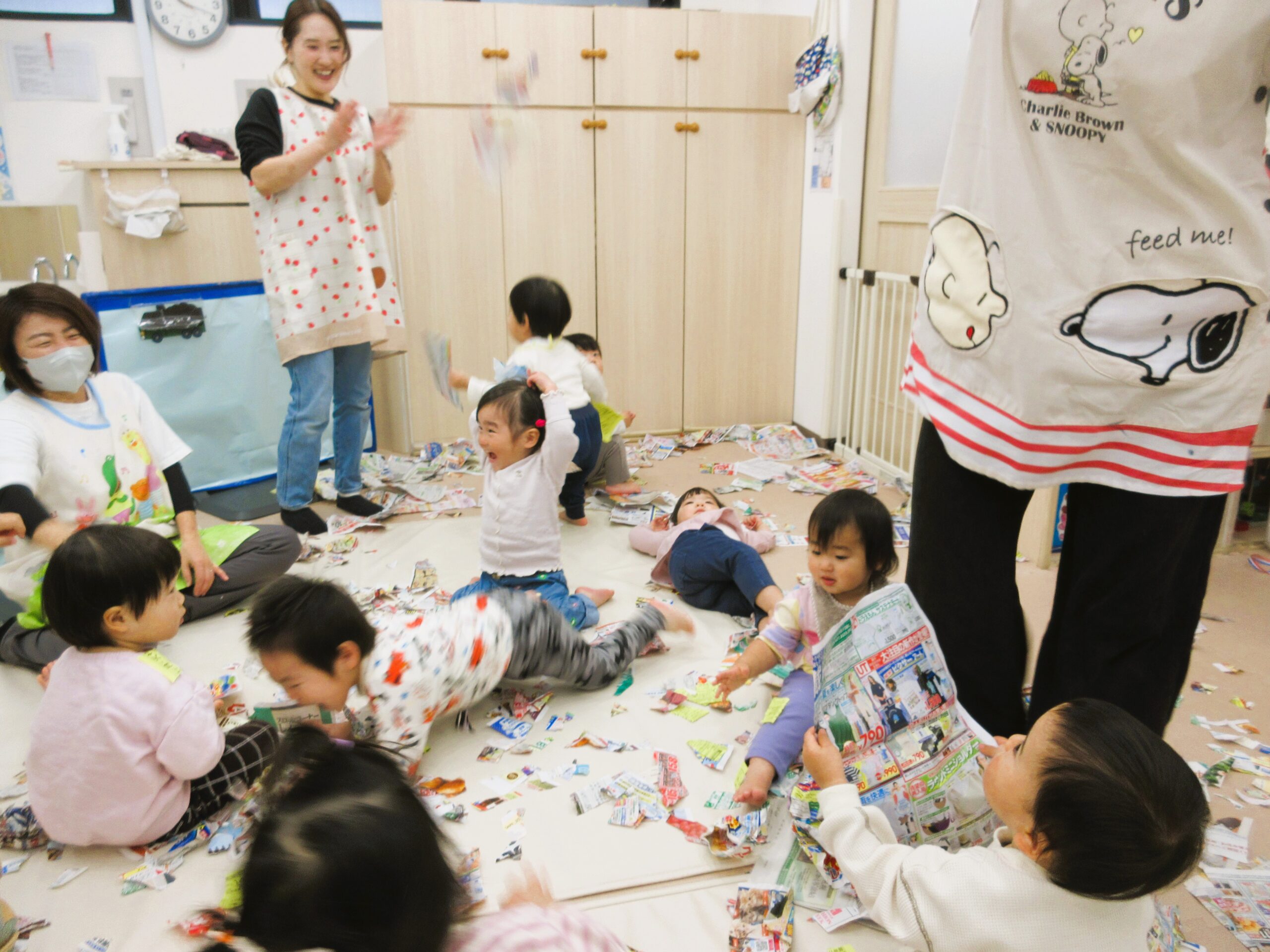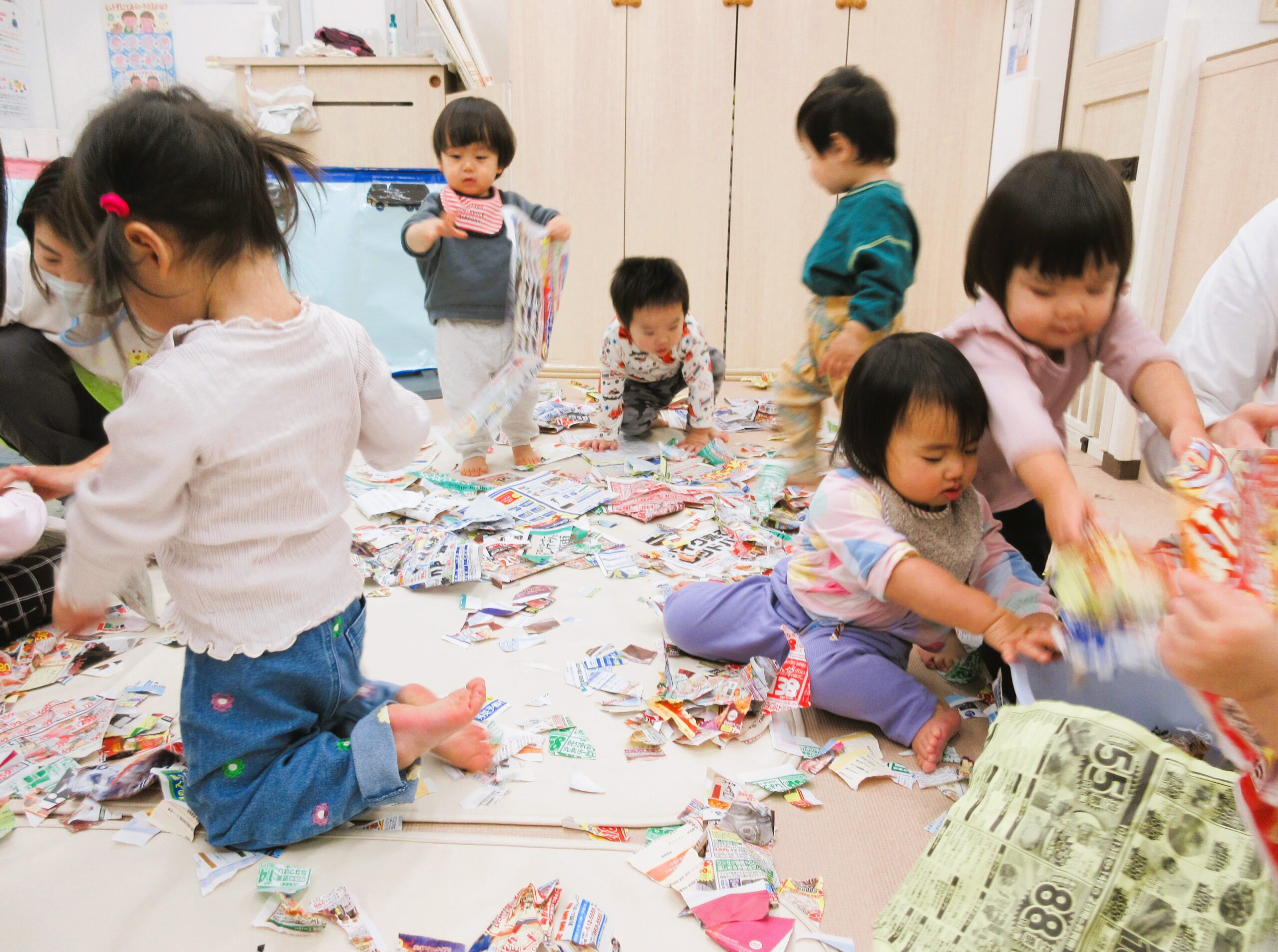 いちご・みかん組さんでは、新聞紙の大雪が降っていましたよ😁⛄
