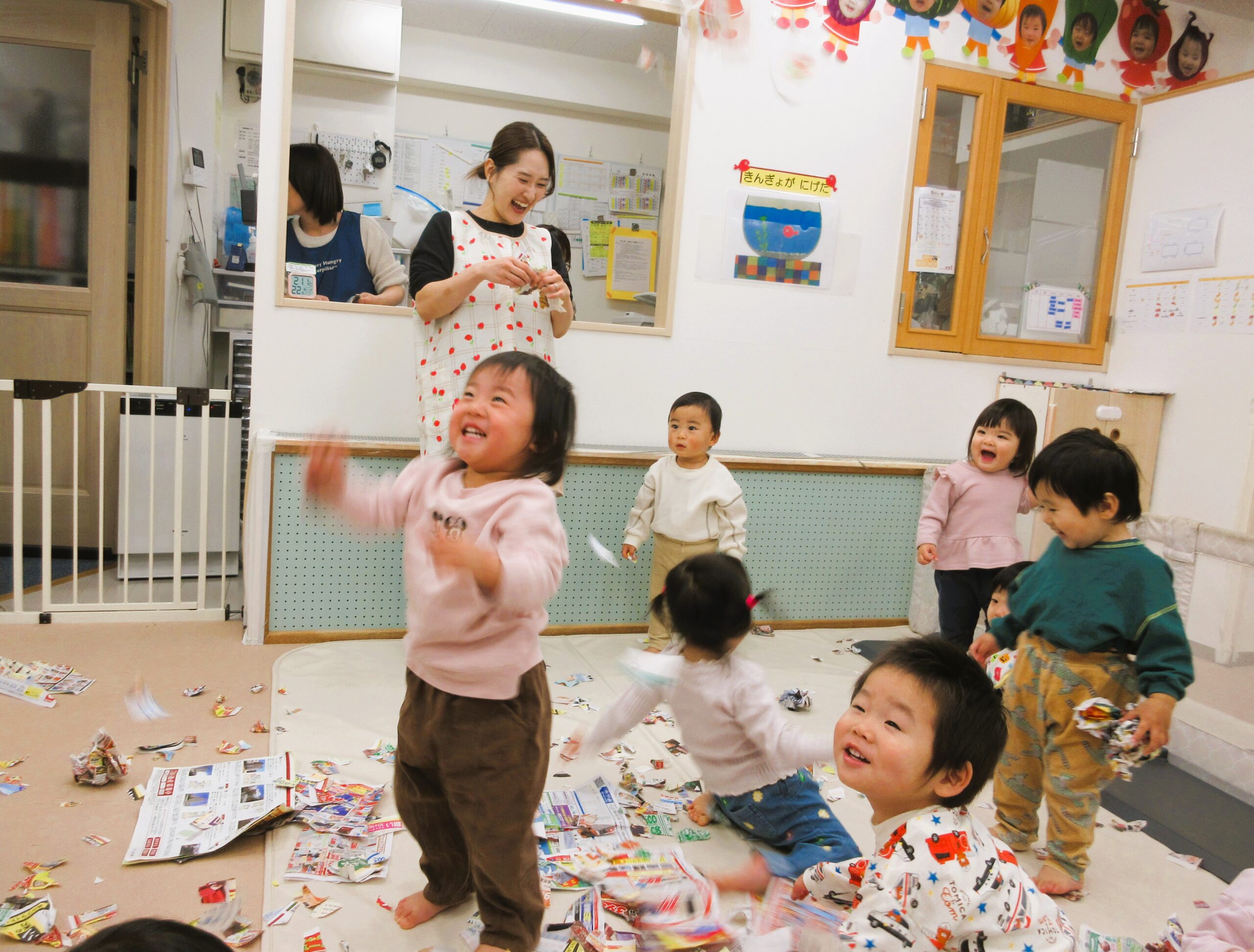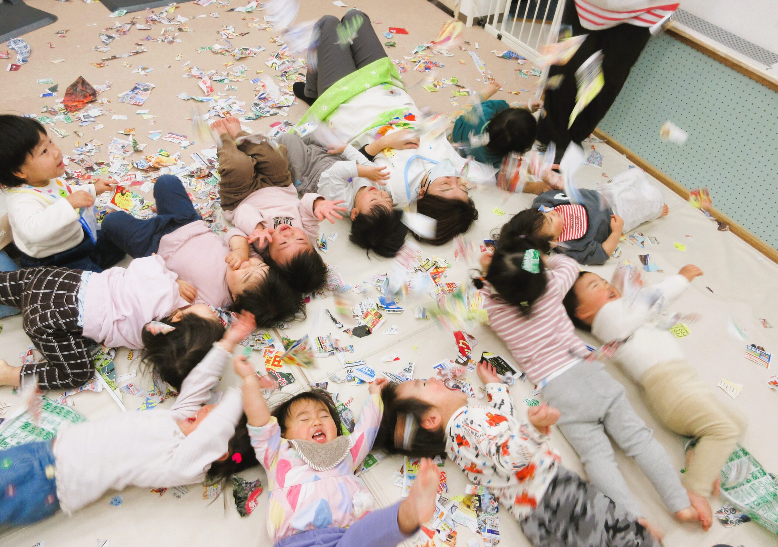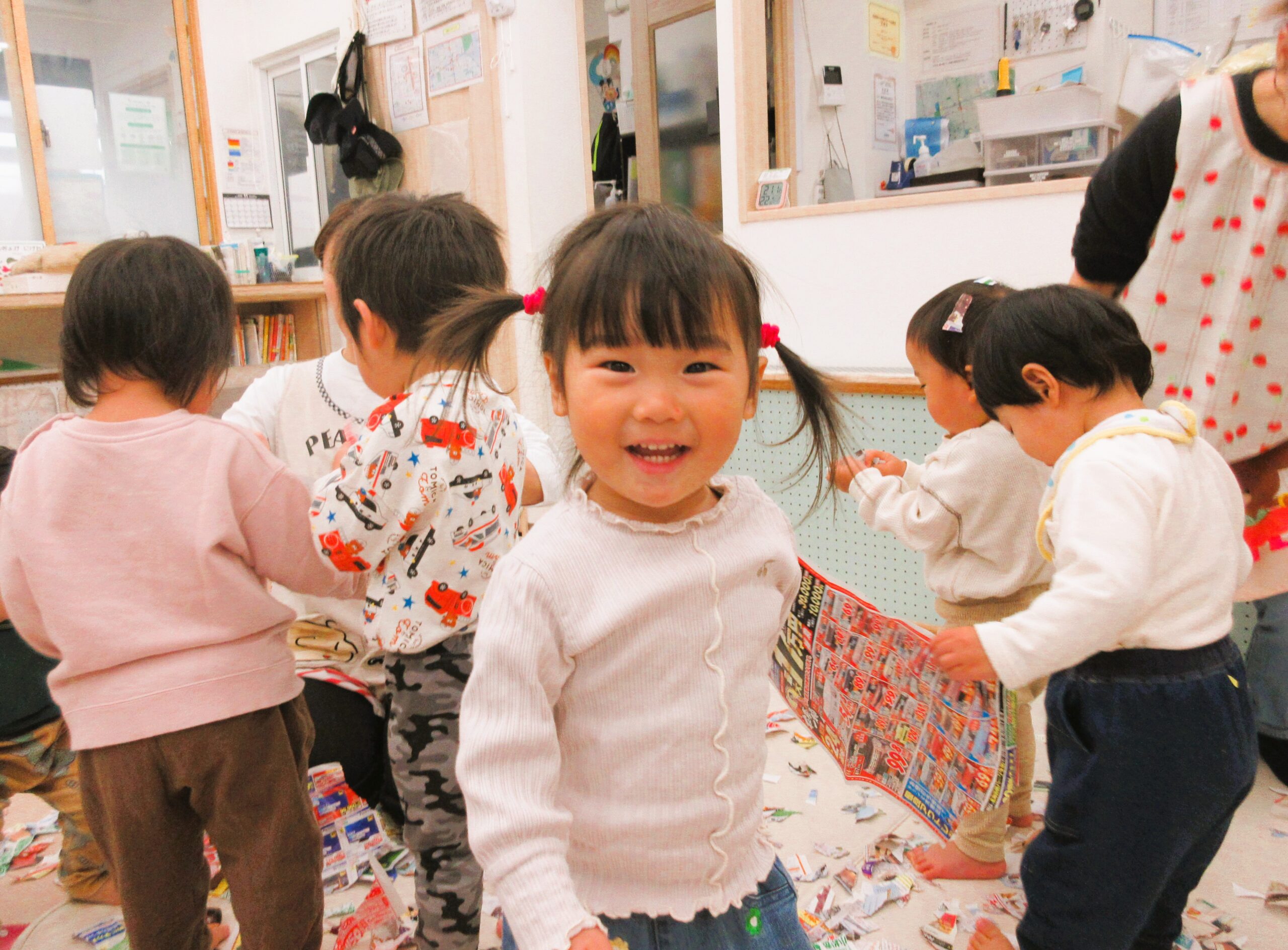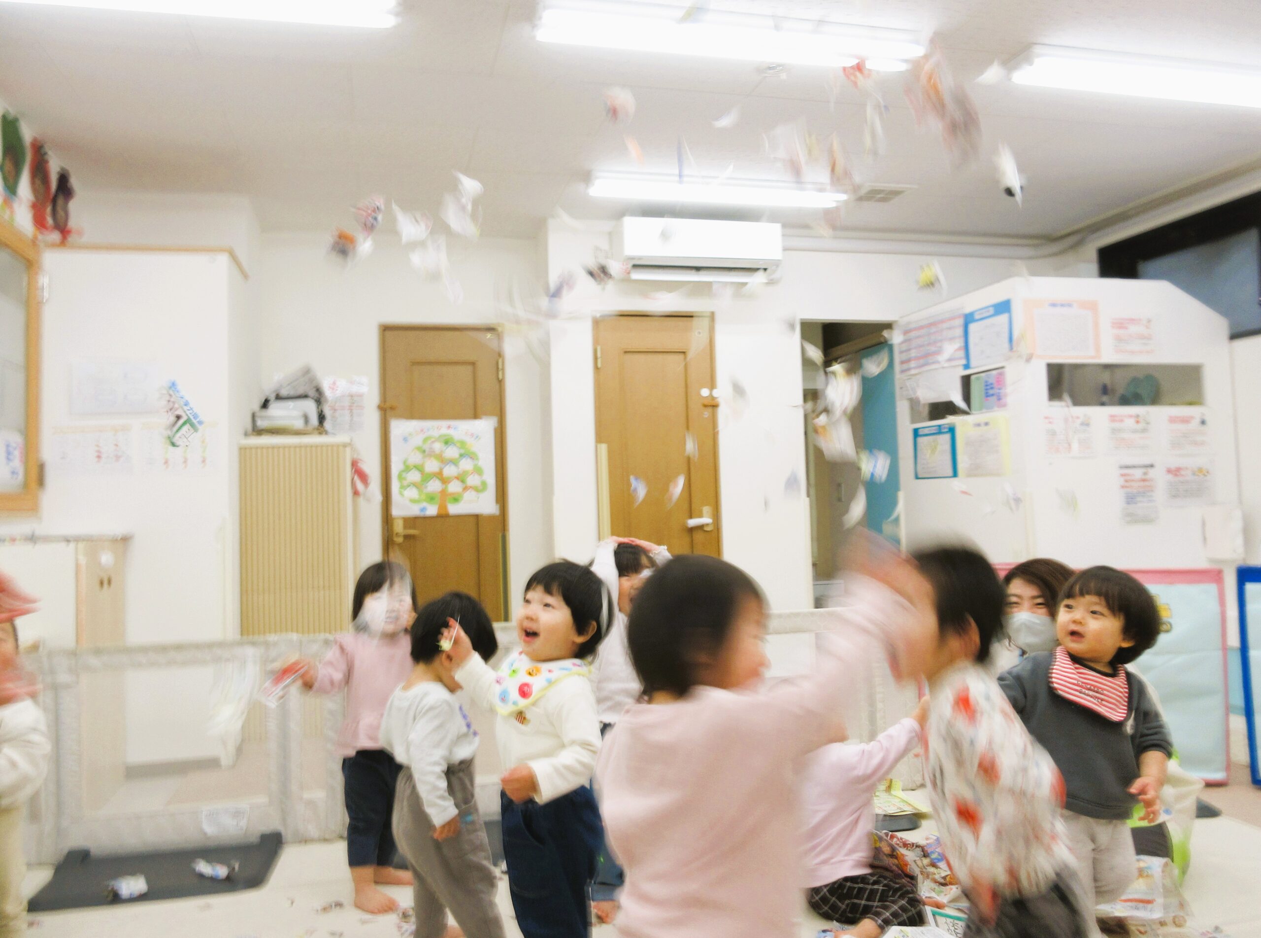 いちご・みかん組さんでは、新聞紙の大雪が降っていましたよ😁⛄