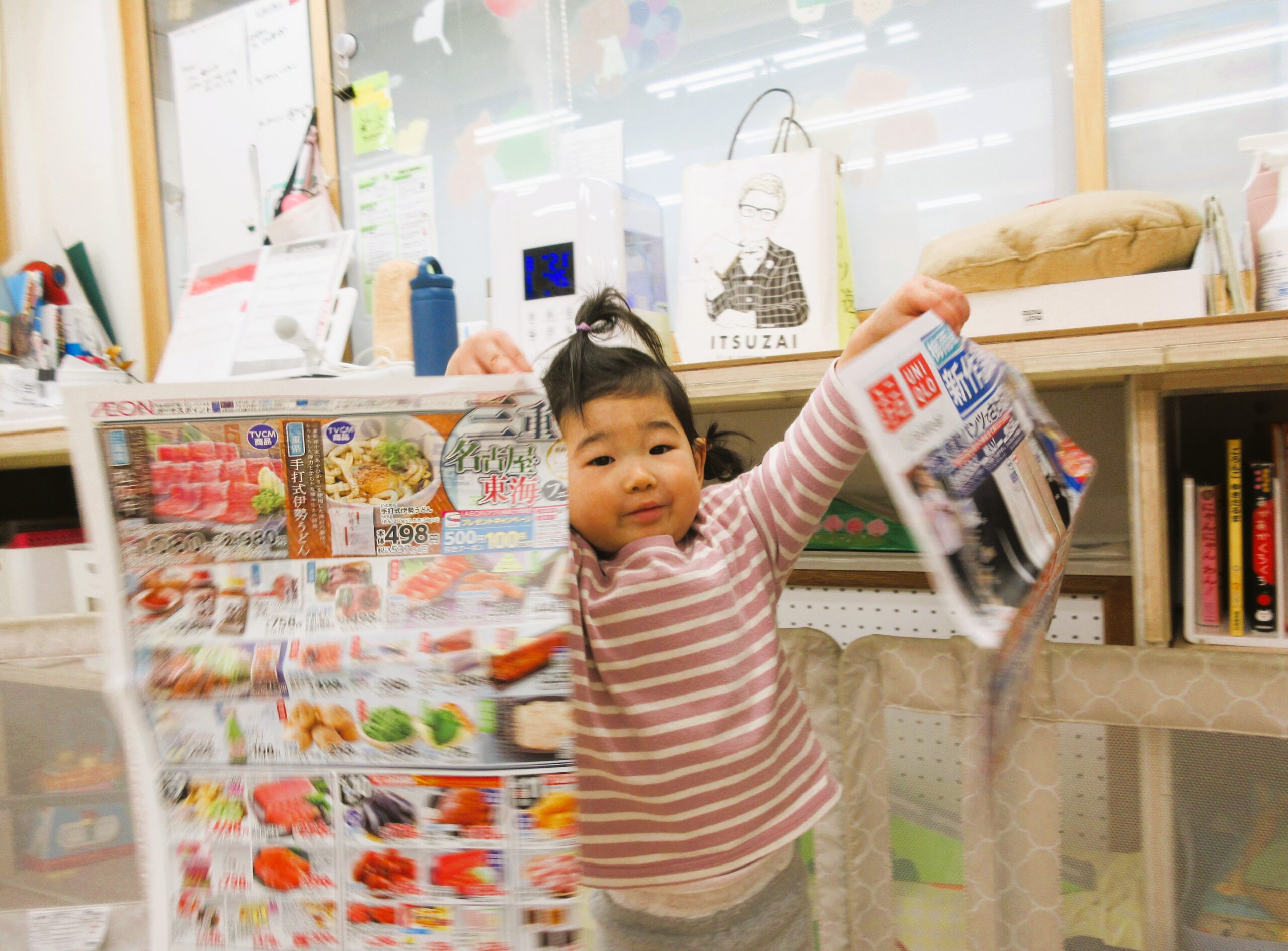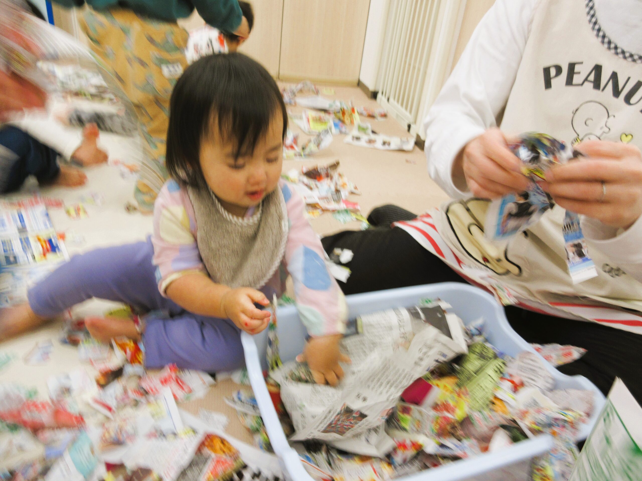保育士から指先を使った新聞のちぎり方を聞くと、