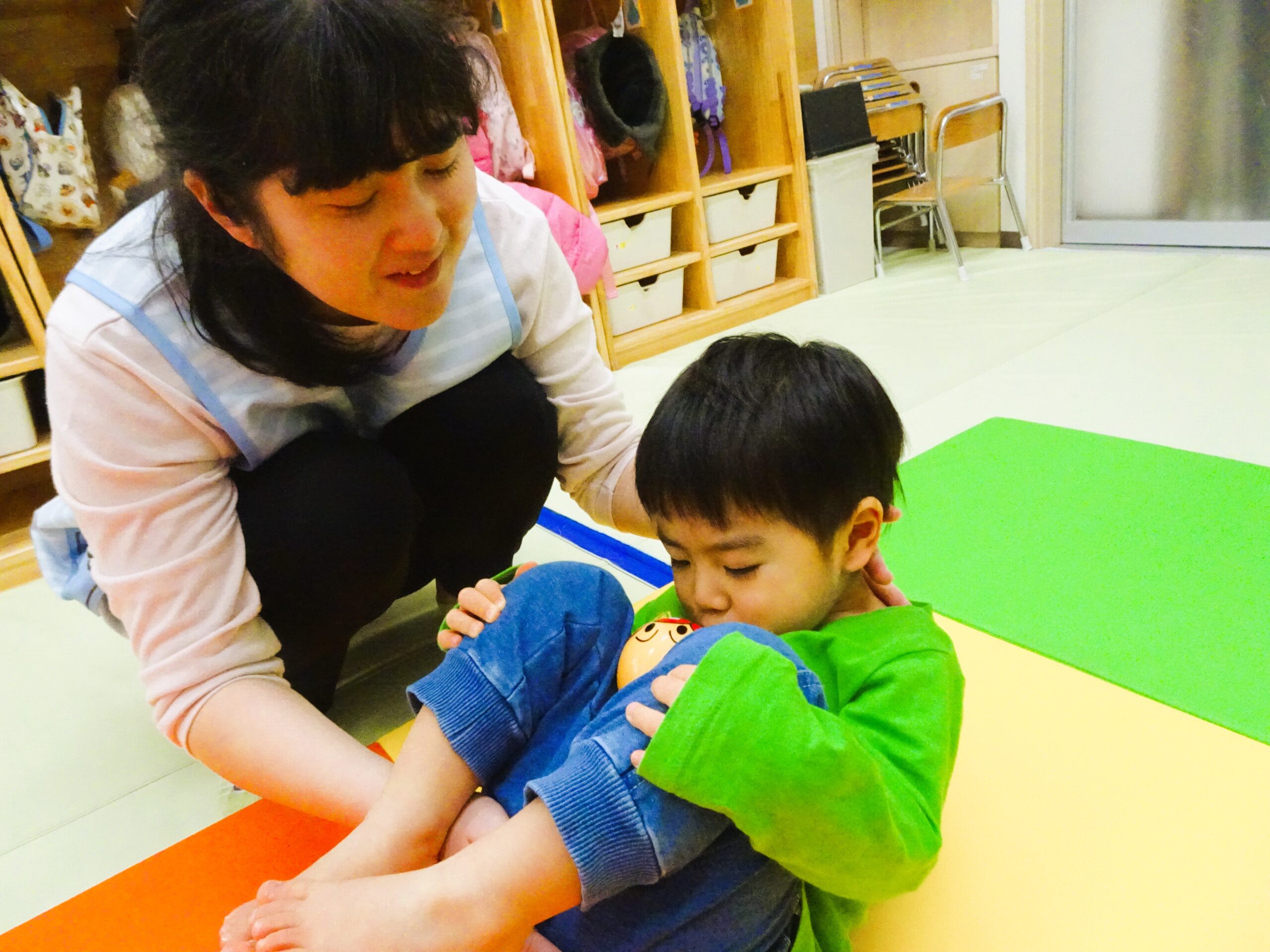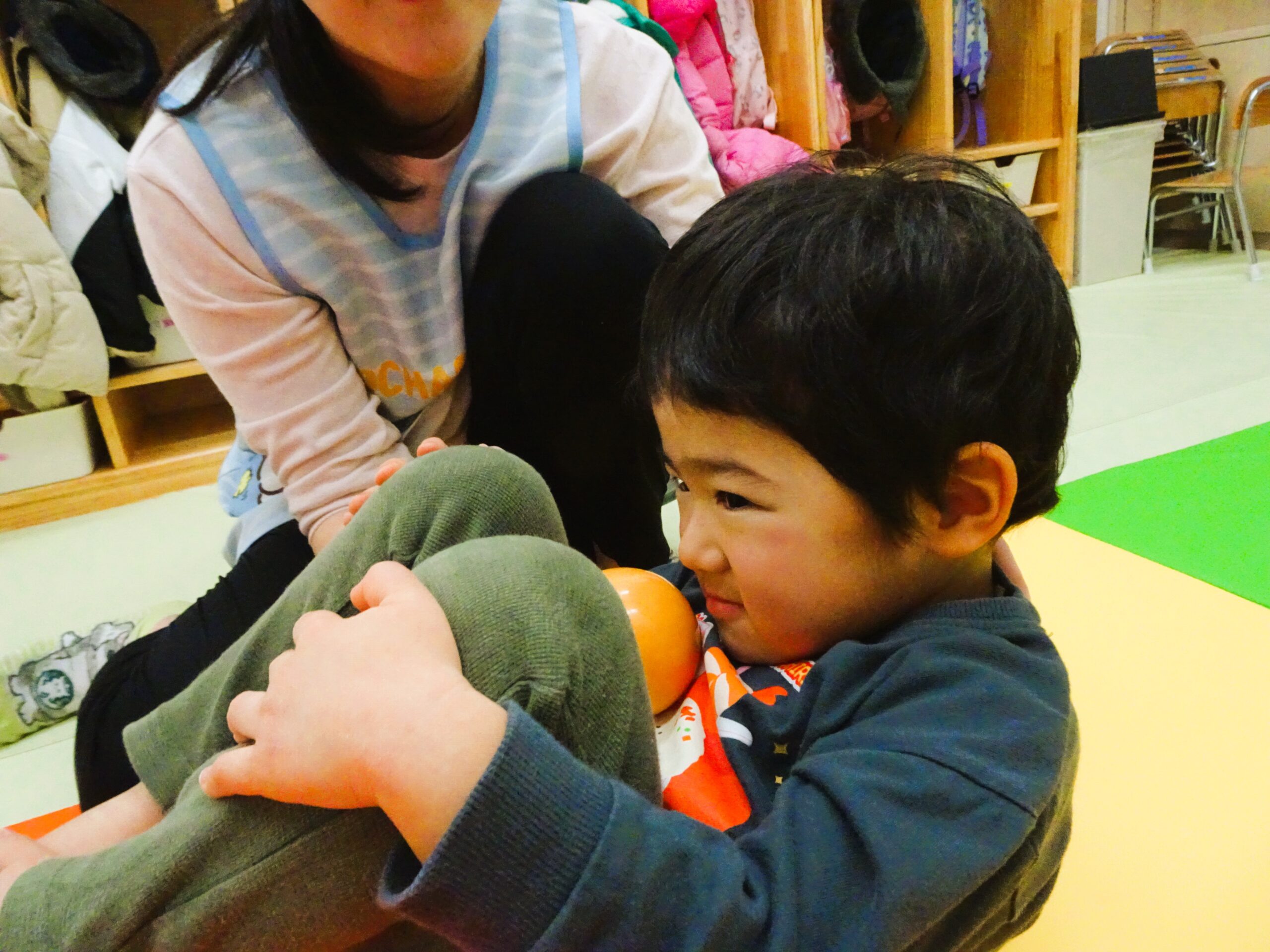 アンパンマンボールを卵に例えて「落とさないように~…!!」と言いながら、