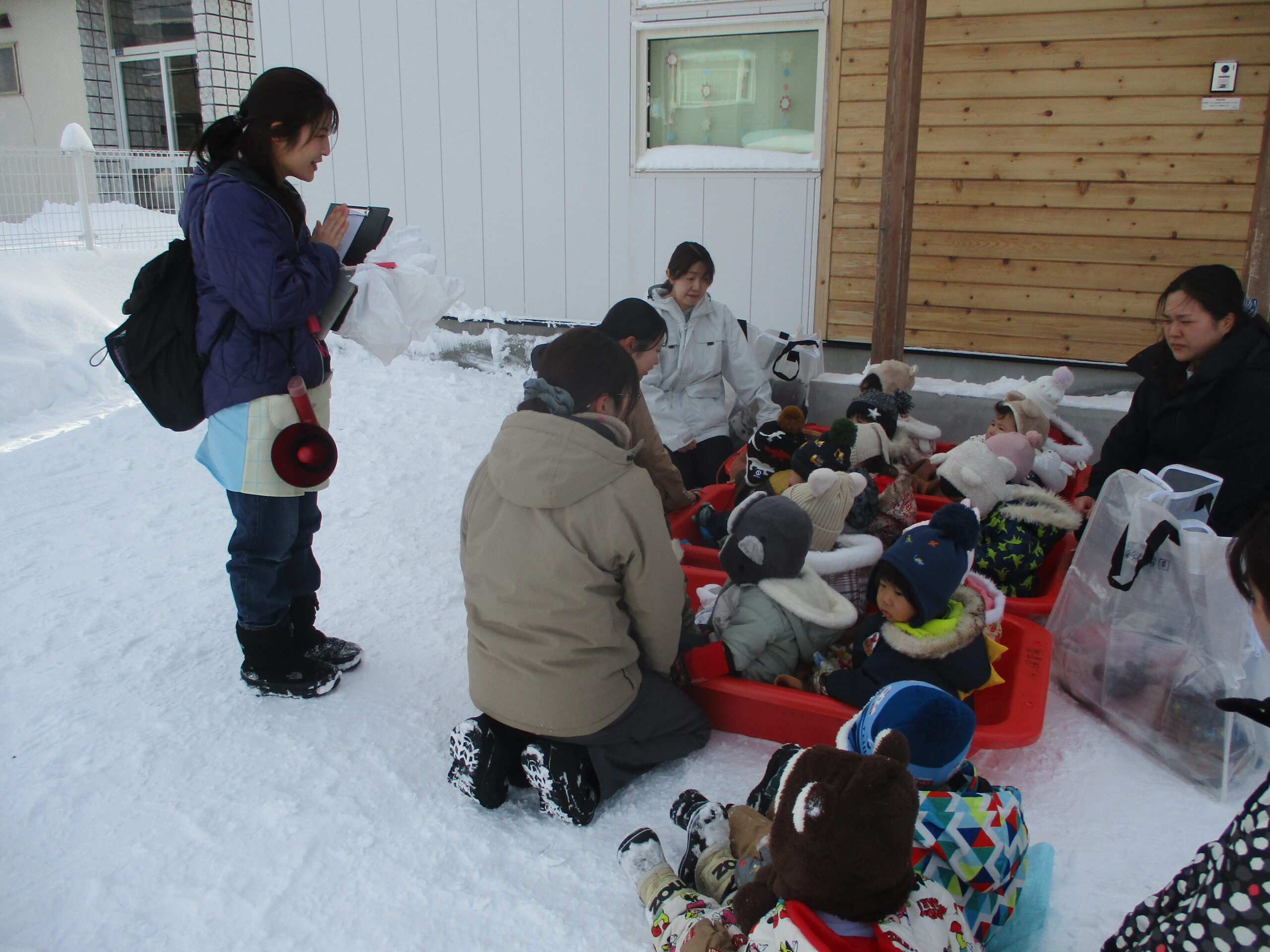 毎月、地震や火事を想定して行っている避難訓練ですが、冬の避難訓練は防寒も必須となります!