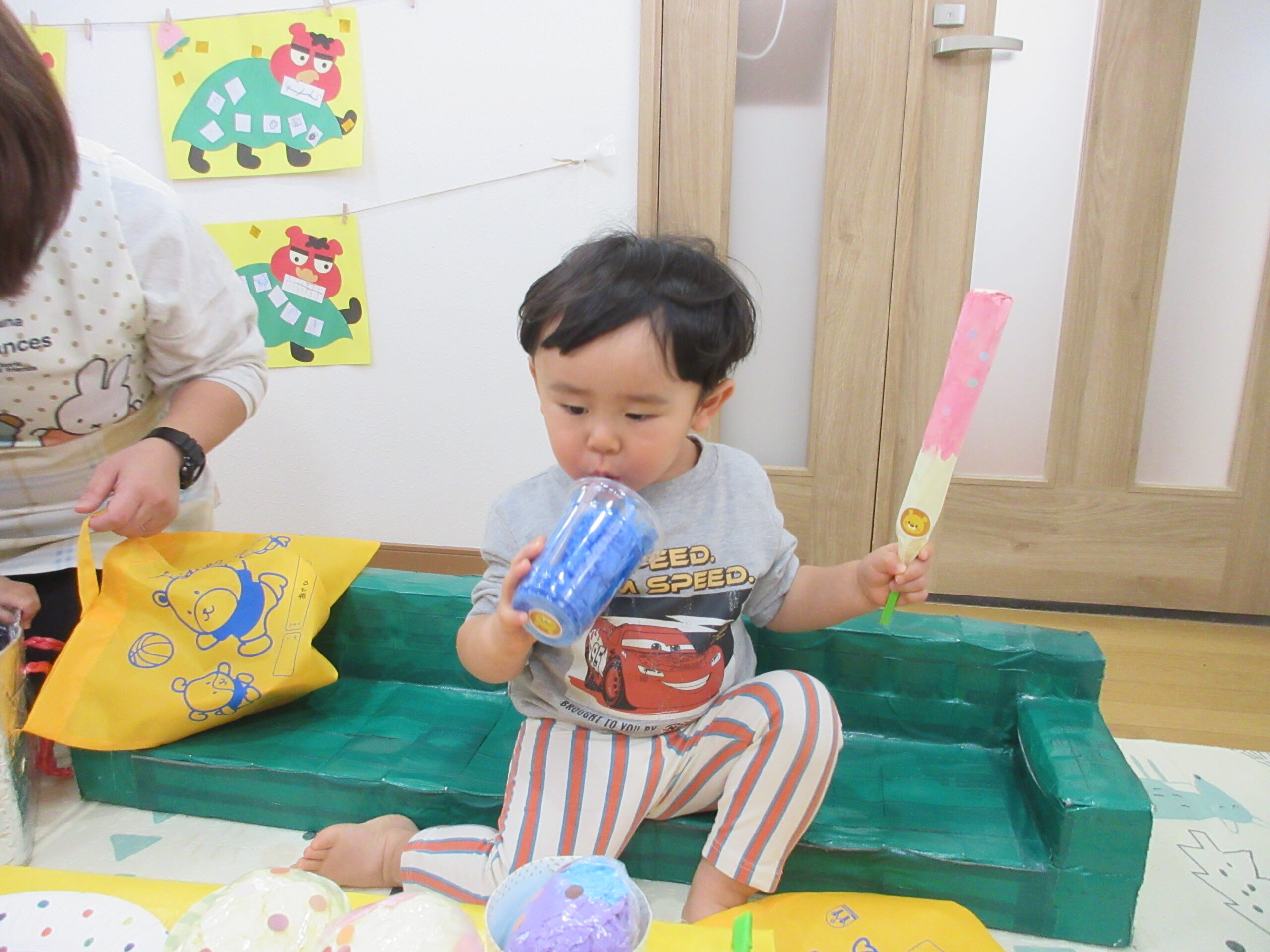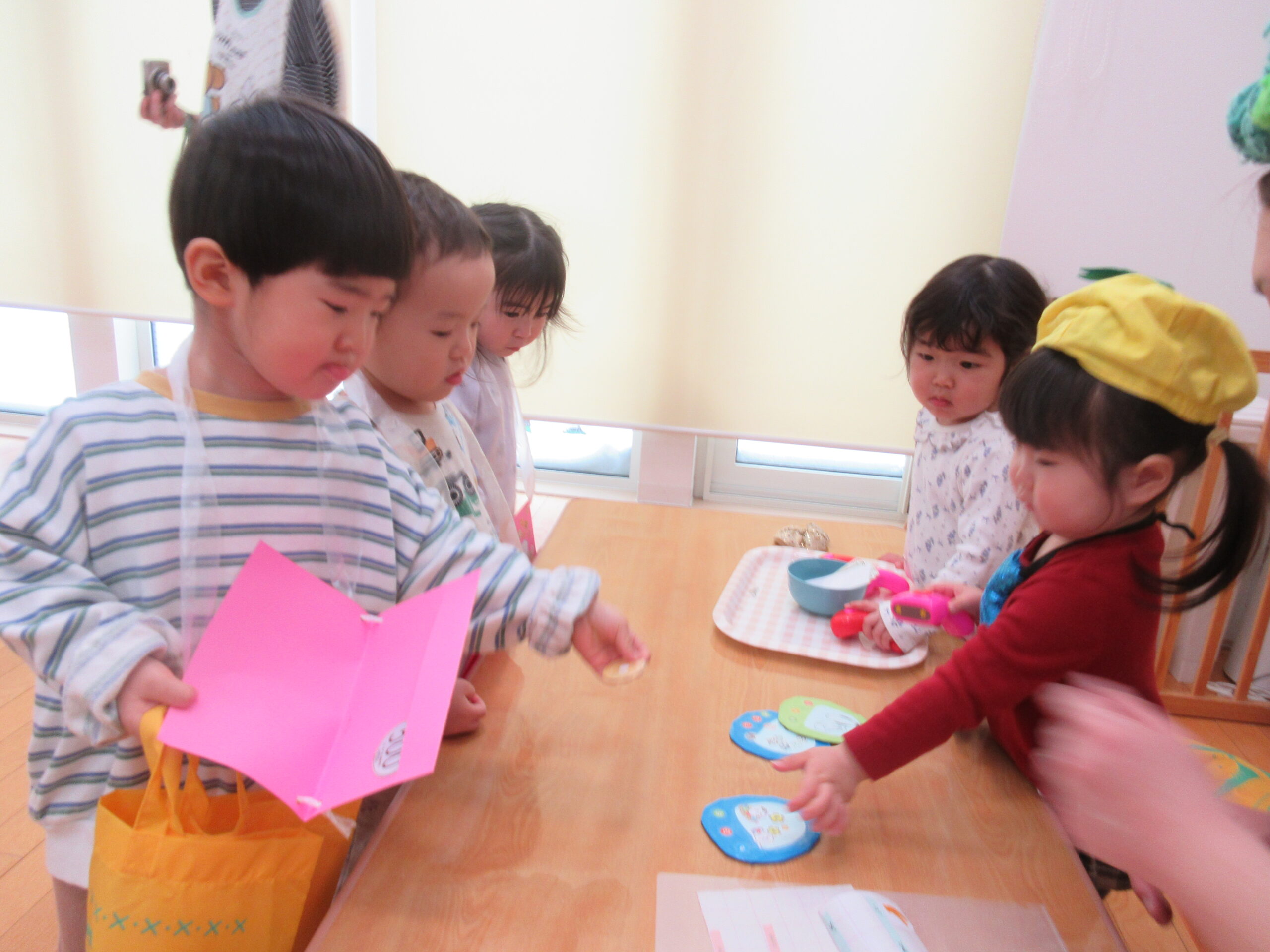 本日、お土産として自分たちでお買い物した商品を持ち帰ります😊ぜひ、お家でも今日のおみせやさんごっこのお話聞いてみてくださいね🎵