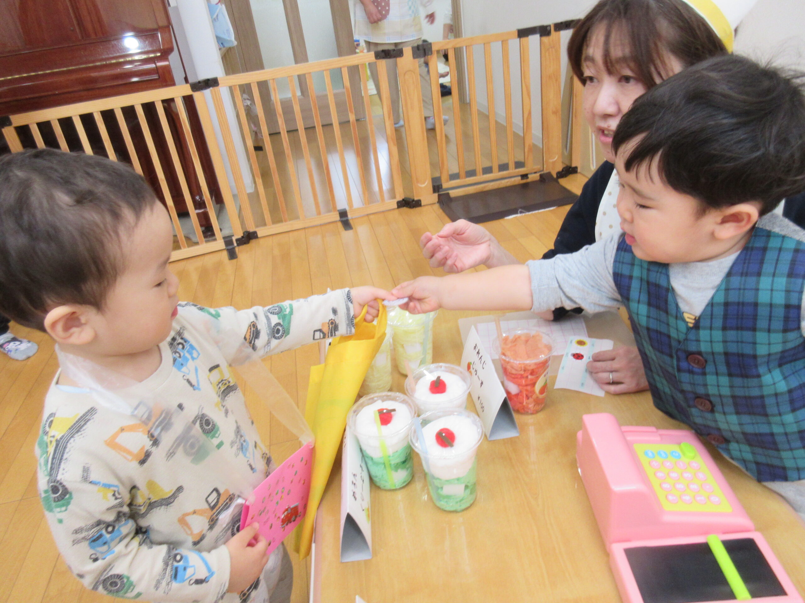 「これください✋」と言われたら⇨お金をもらい⇨商品を渡す、という流れもしっかりと覚えて、普段お家の人とお買い物に行っている姿を思い出しながら行っているようにも見えました😊