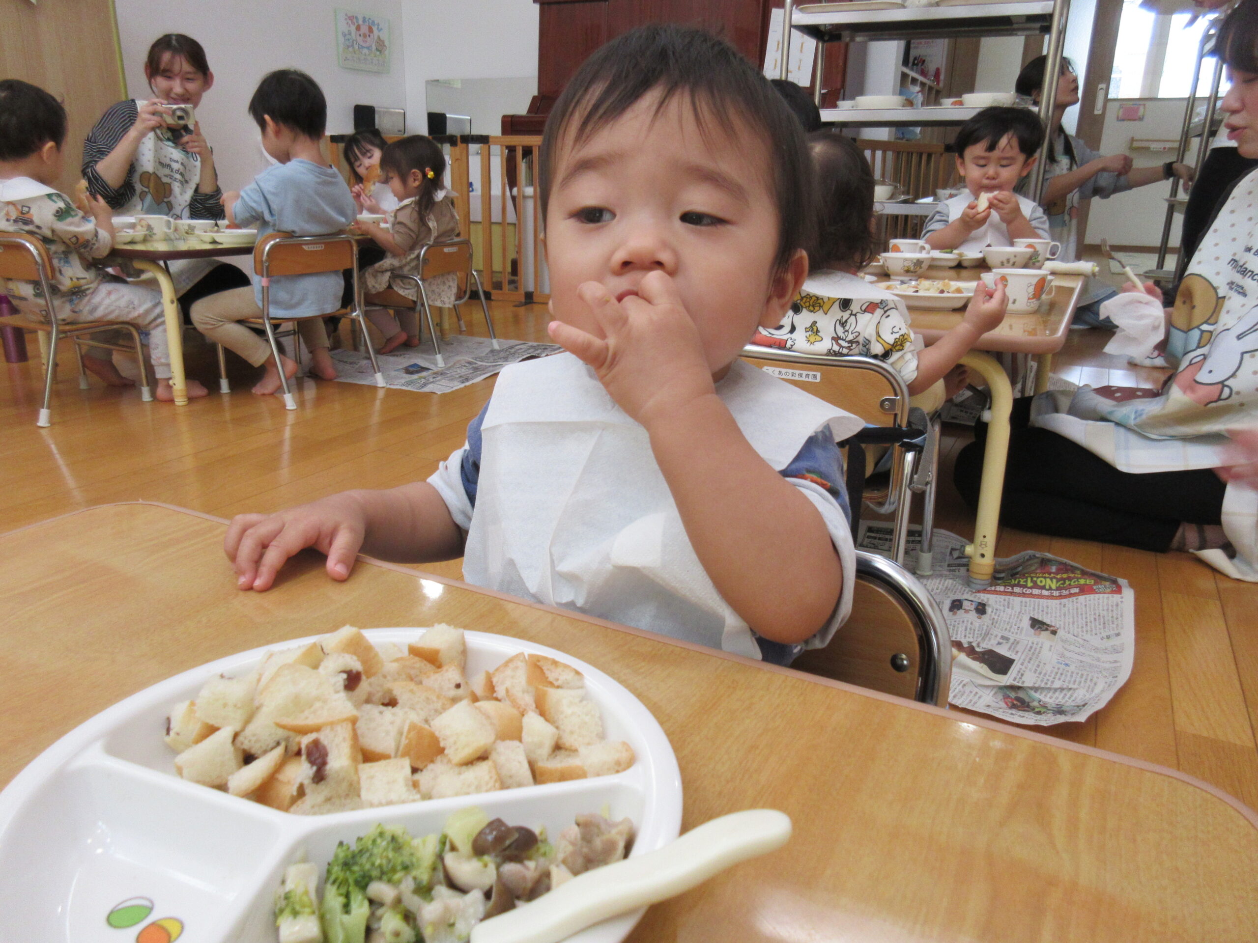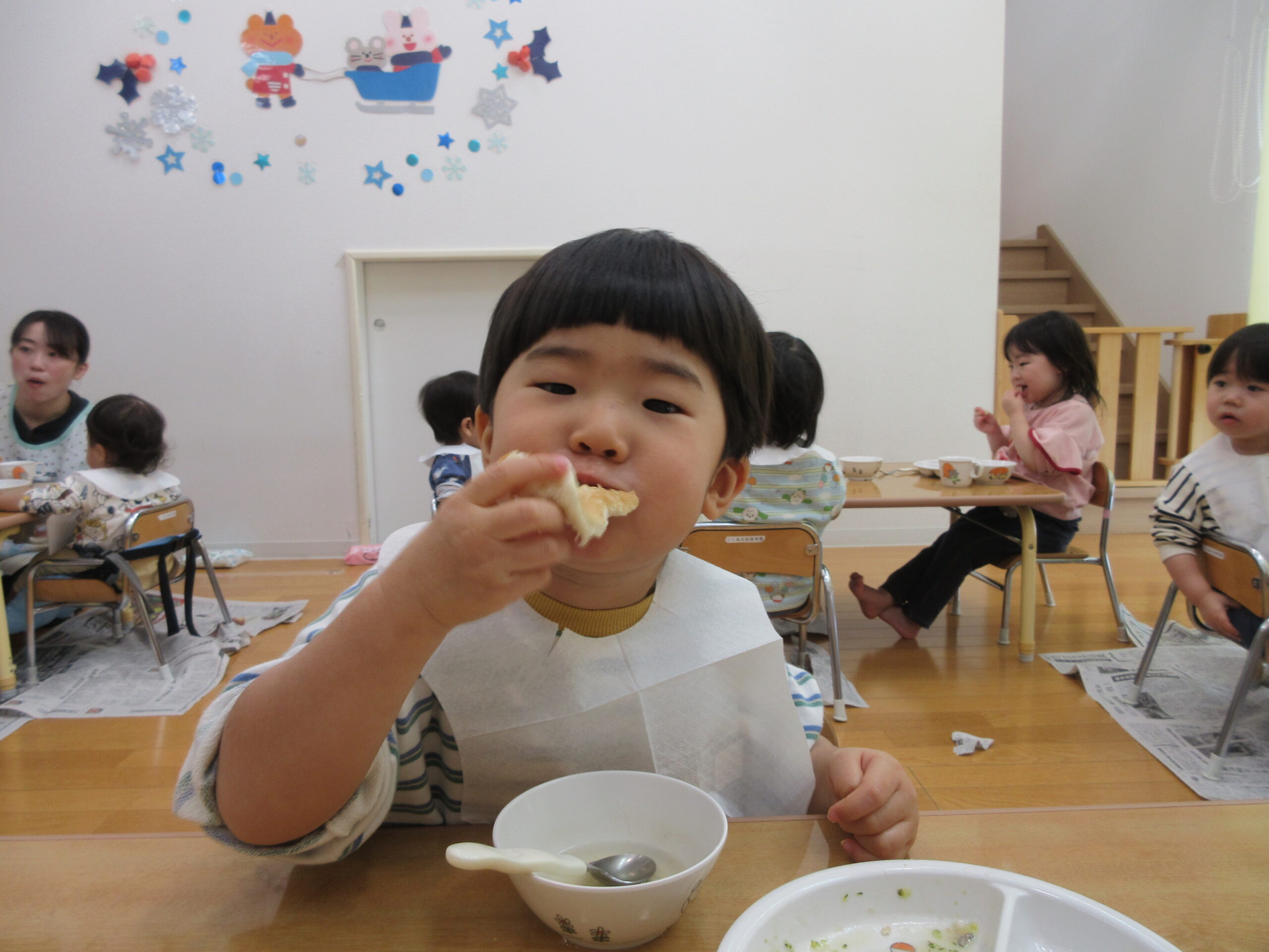 給食は、みんなで食べましたよ!話題は楽しかったおみせやさんごっこの話でもちきりです🤭
