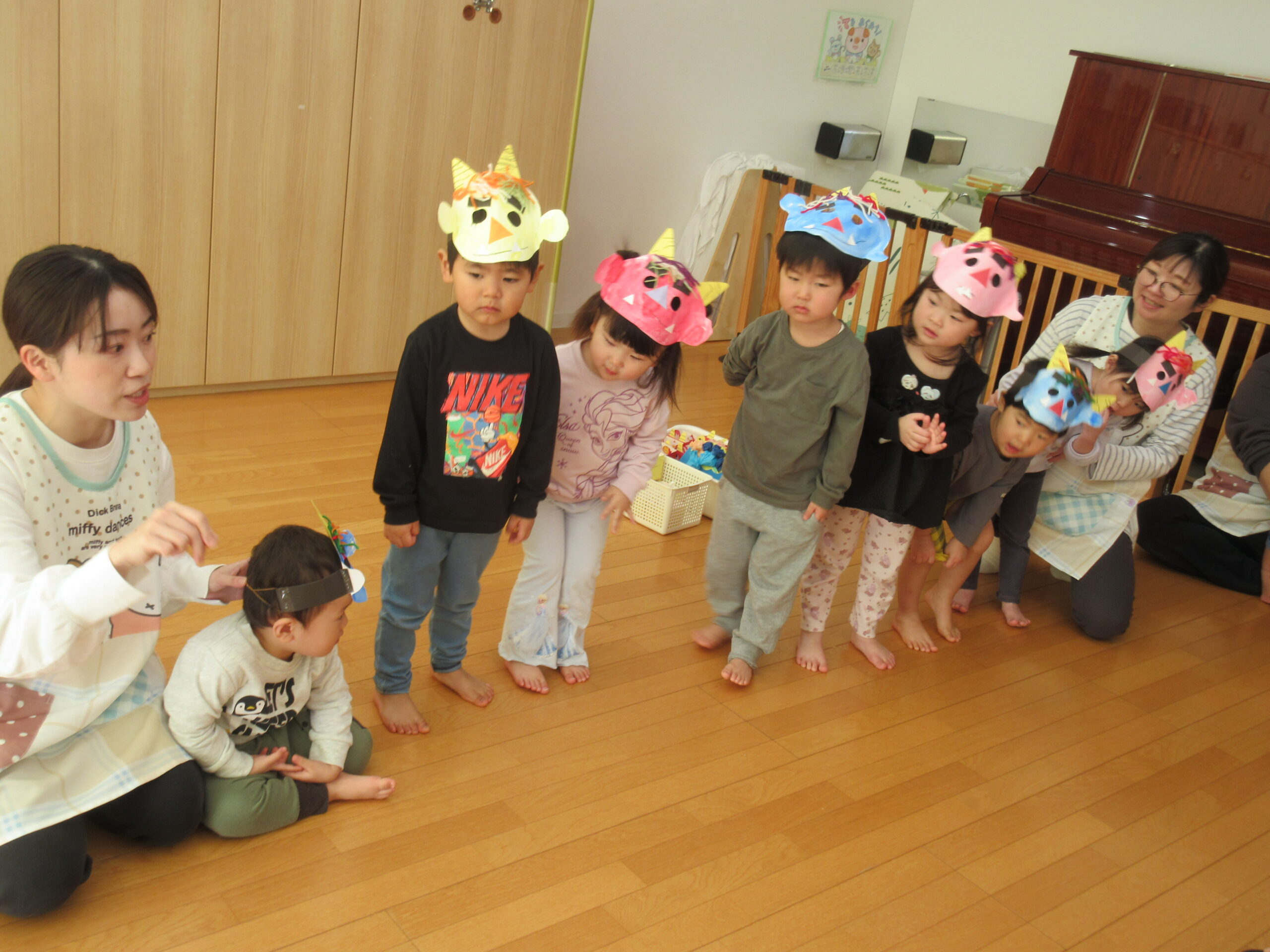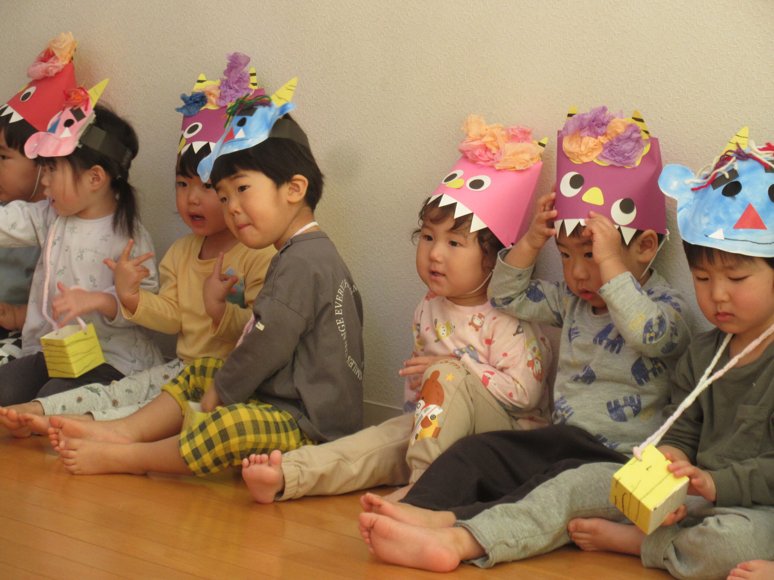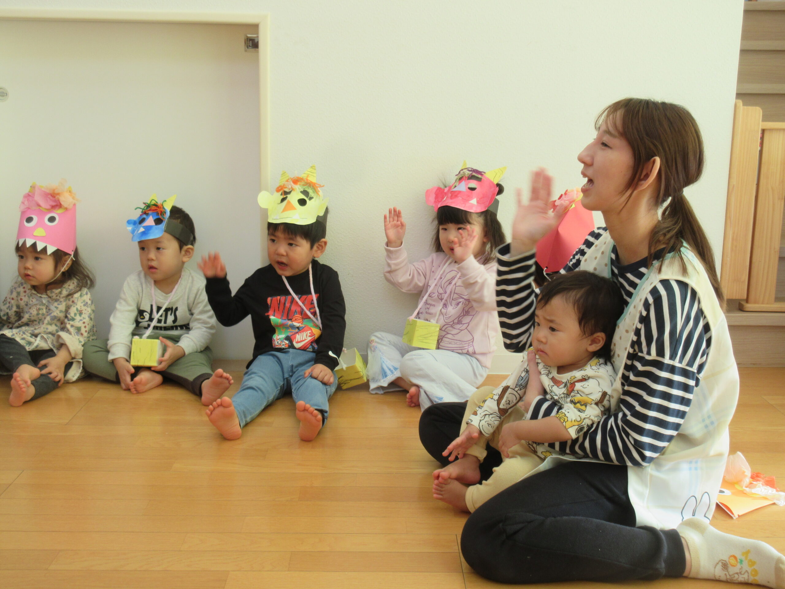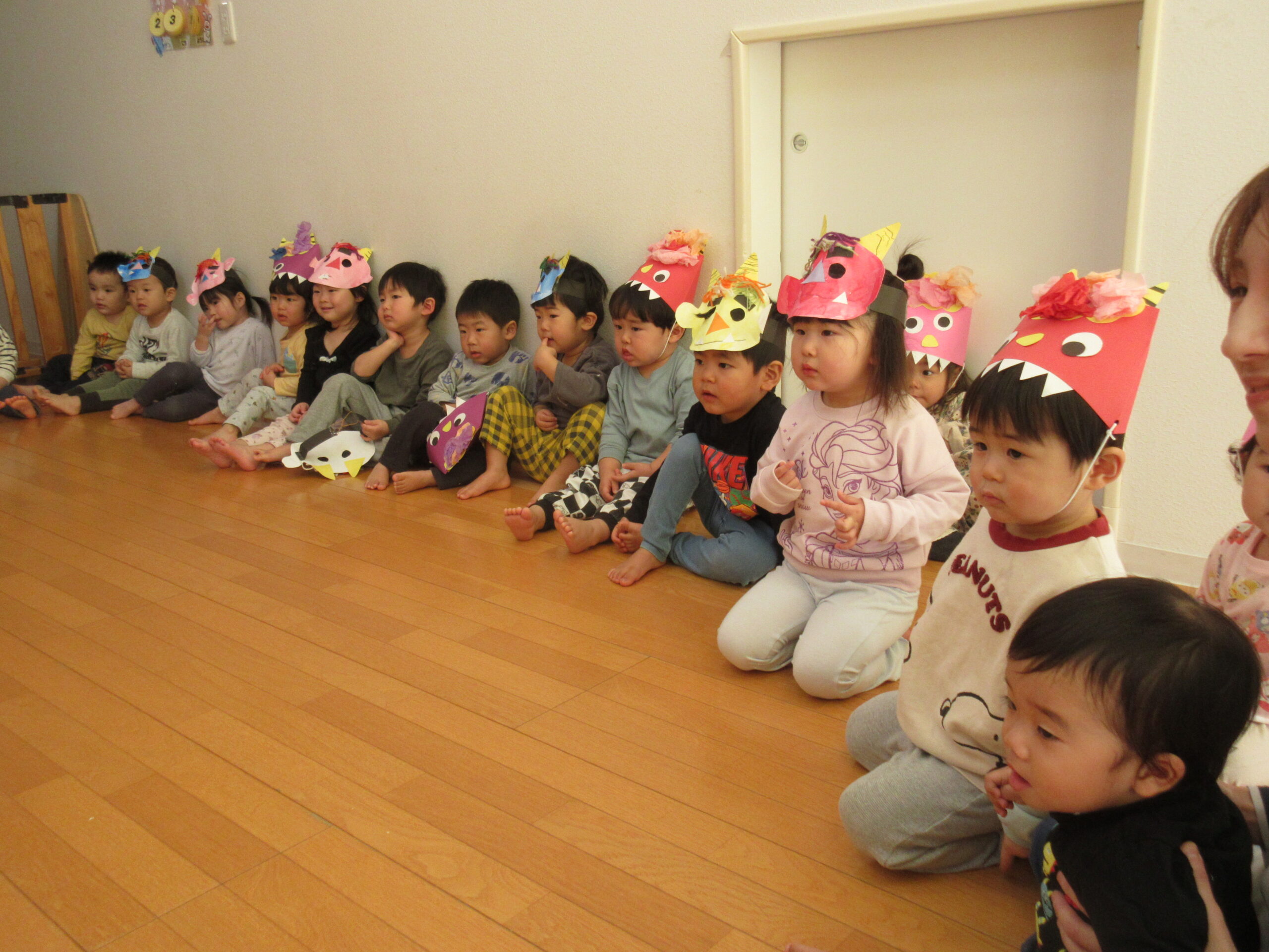 みんなが集まったところで、まずは紙芝居を見ました!節分についての紙芝居でしたが、みんな真剣な表情👀