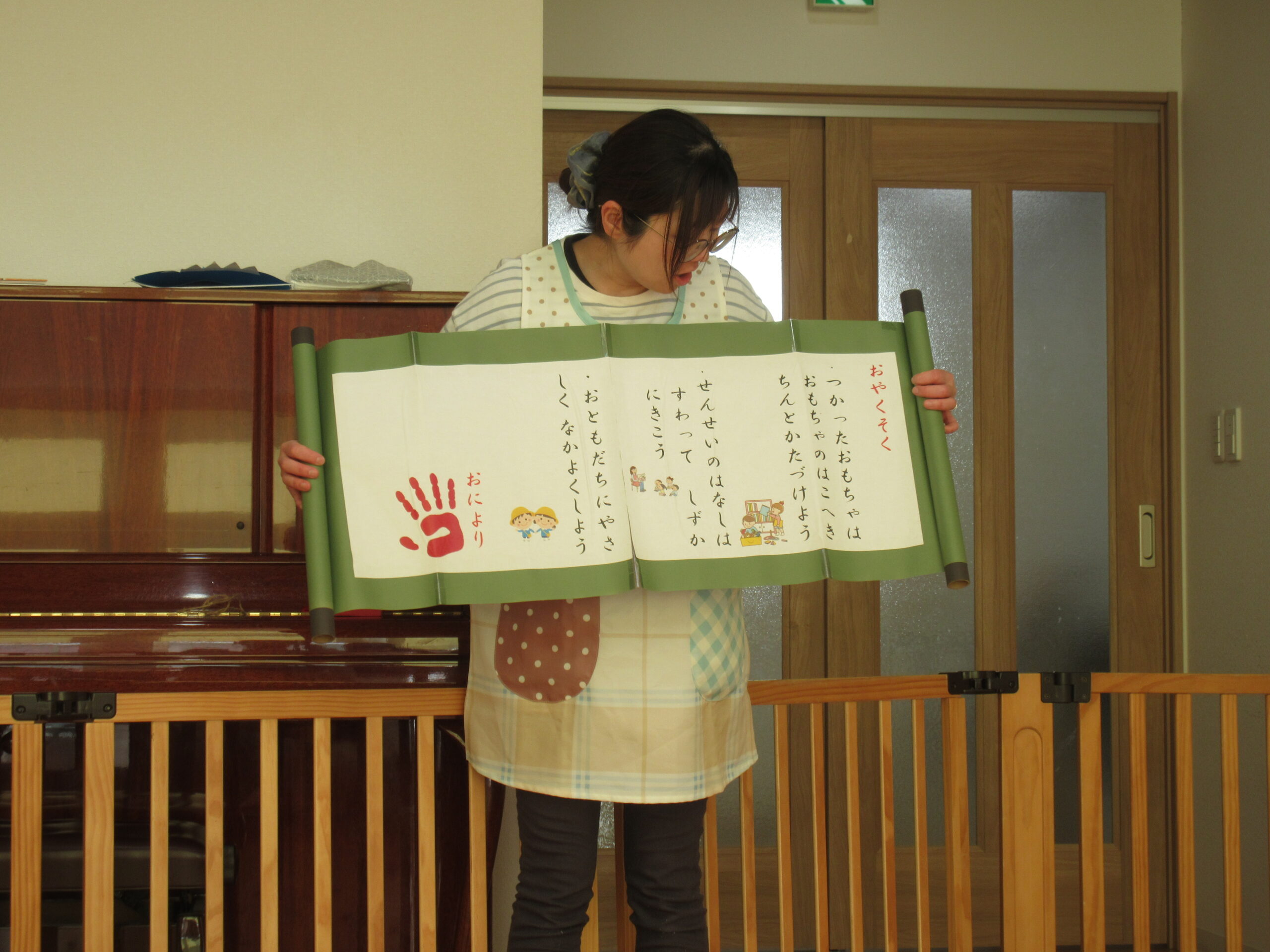 「お友達と仲良くすること」「遊んだおもちゃは、お片付けすること」など、保育園で元気に過ごす約束事が書かれてありましたよ!