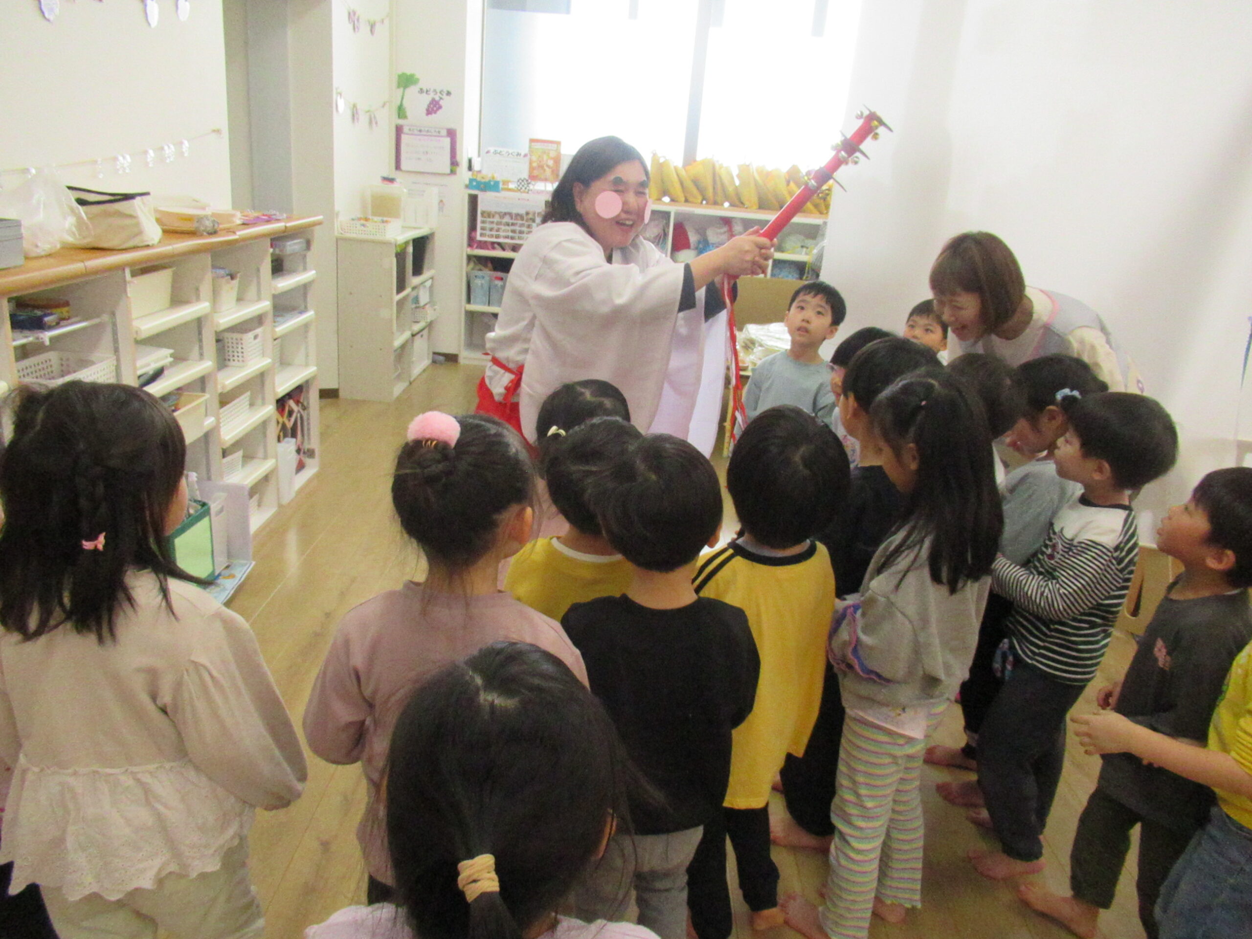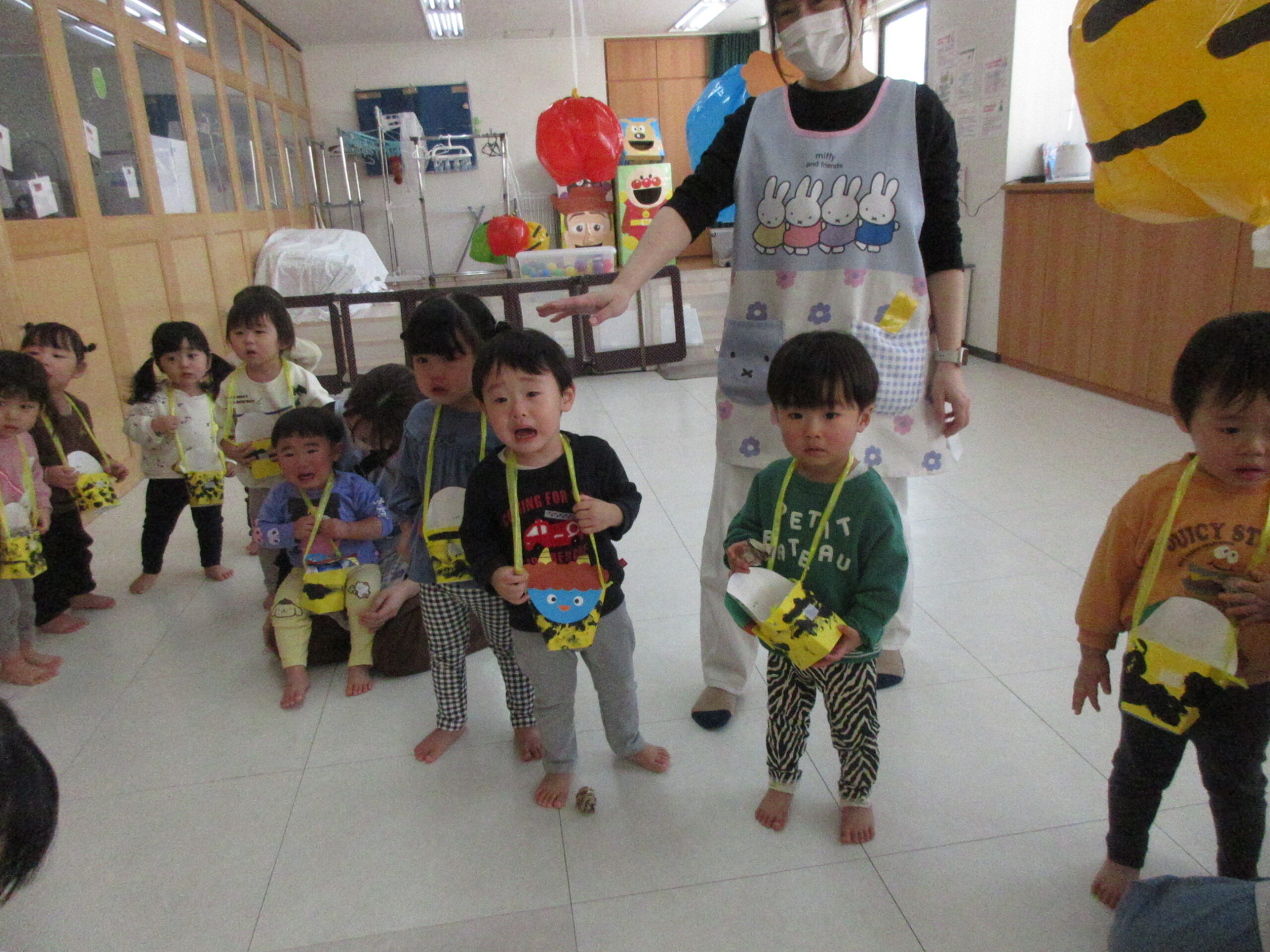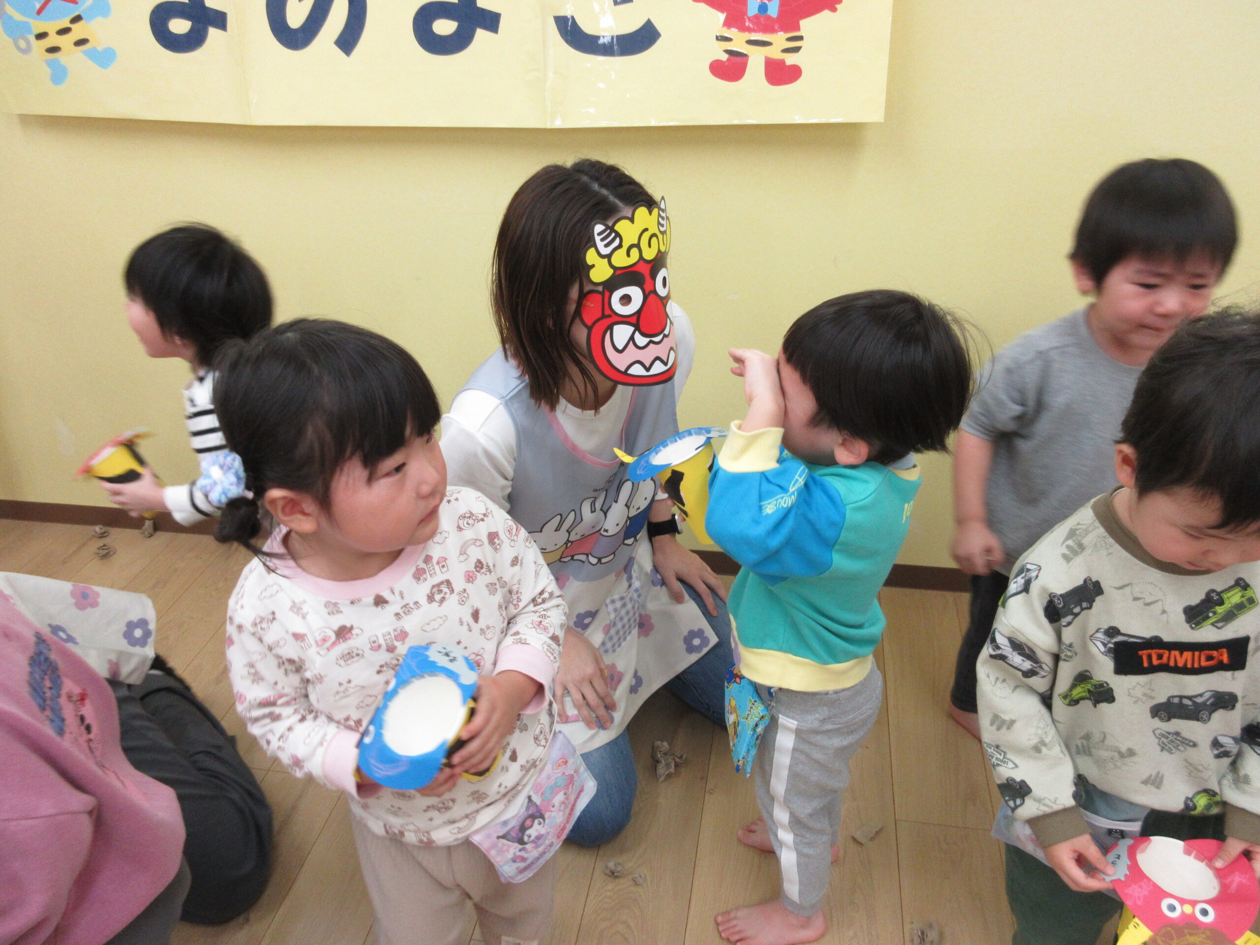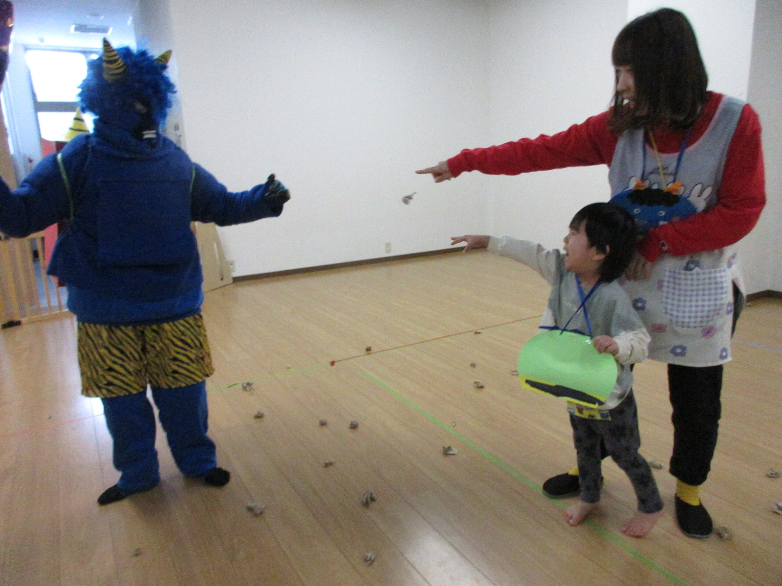 0~2歳児クラスでは、各クラスに鬼のお面を付けた先生がお部屋にやってきました。この姿だけで子どもたちは大パニック!😂💦担任の先生に助けを求めながらも、小さなおててで頑張って豆まきをしました。