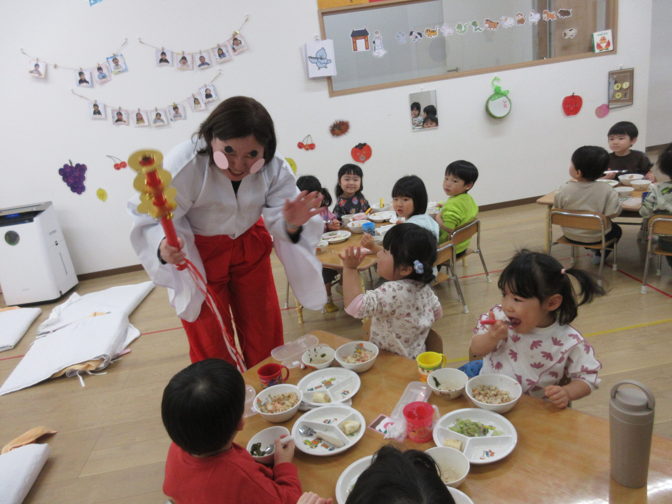 無事に終わってお部屋へ・・・ホッと一息ついていると、今年はなんと福の神様もりこの森保育園に来てくれました💗