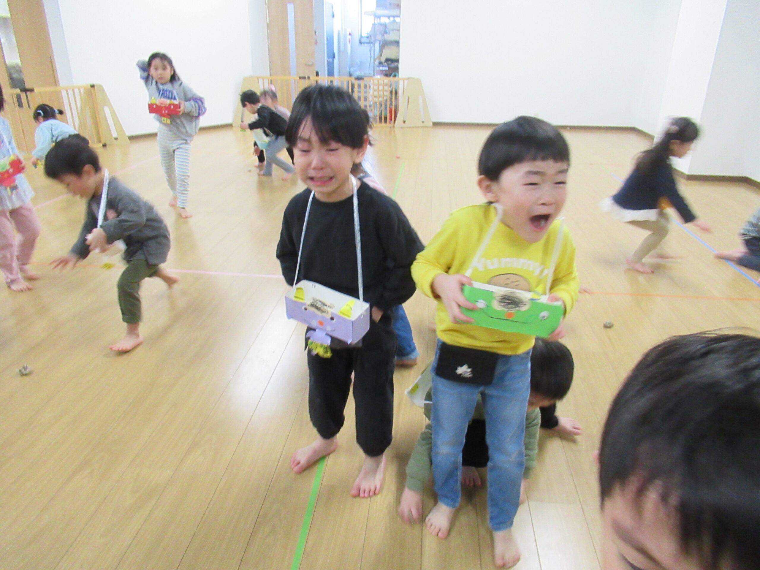 怖いのを我慢しながらも勇気を出して豆をまく子、やっぱり涙してしまい必死に逃げる子、果敢に豆を撒く子と様々でした😊各クラス鬼退治は大成功✨みんなの中の悪い鬼はいなくなったかな?
