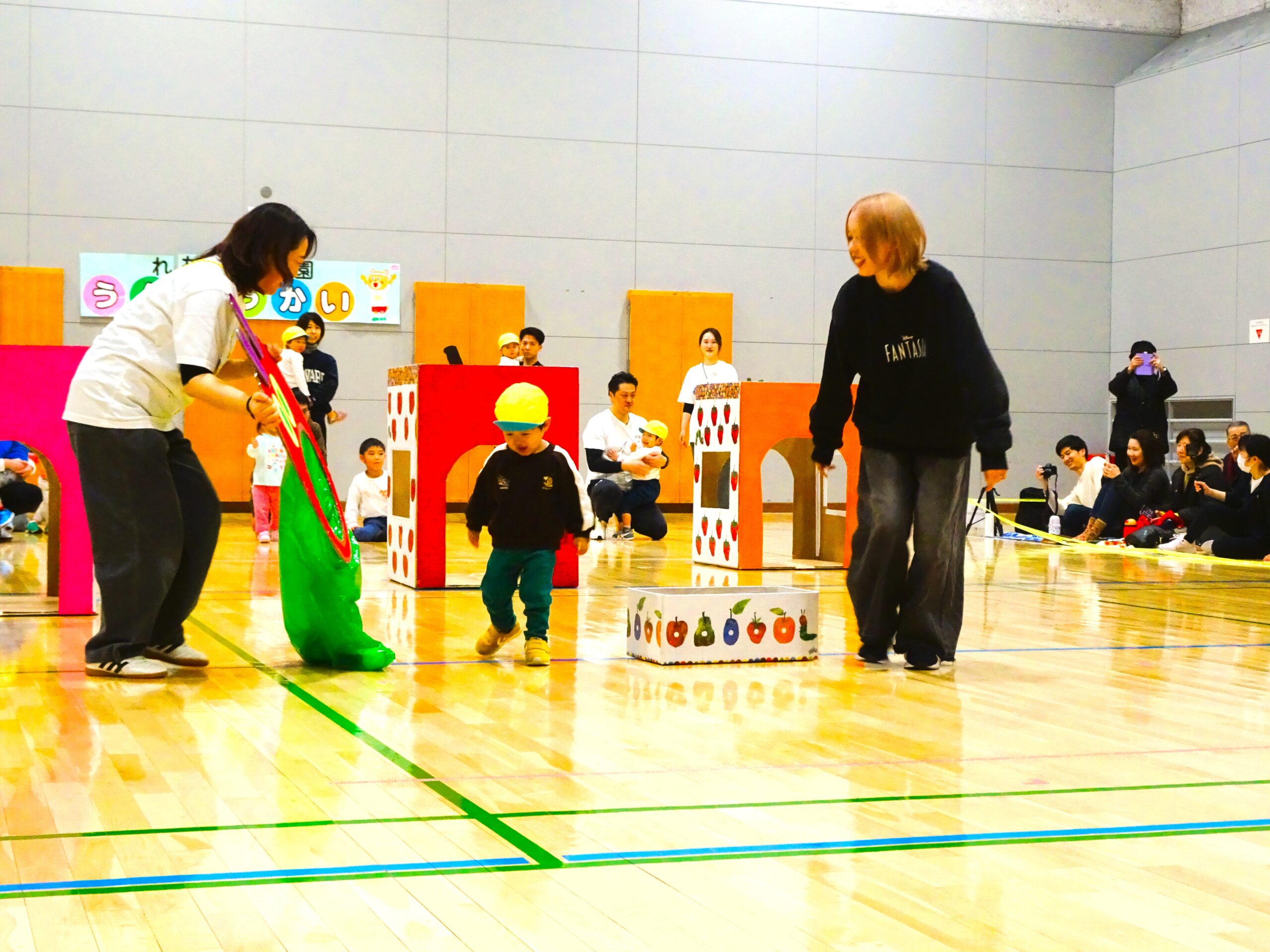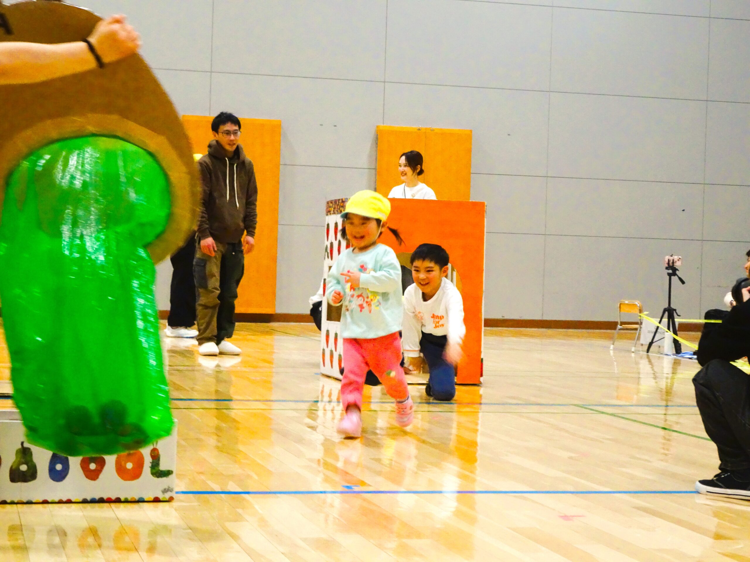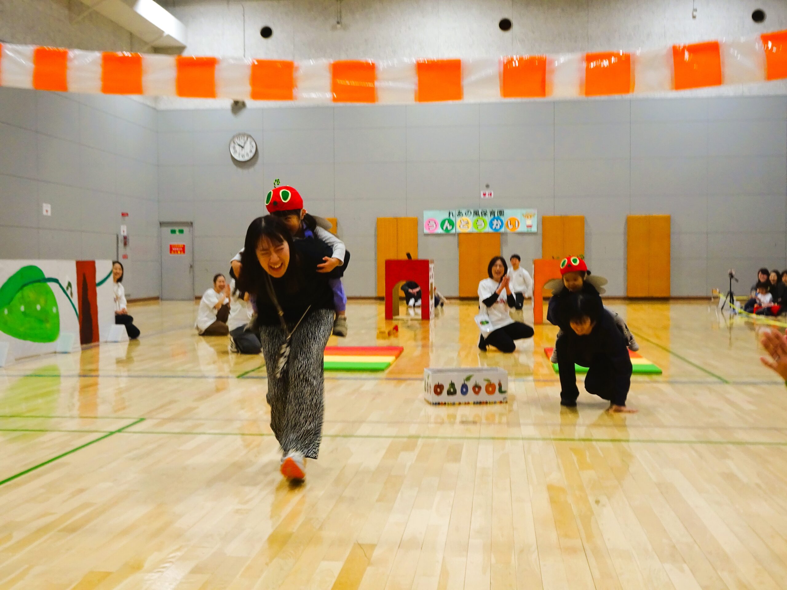 親子競技では、子ども達の大好きな絵本『はらぺこあおむし』の世界を楽しみながら、