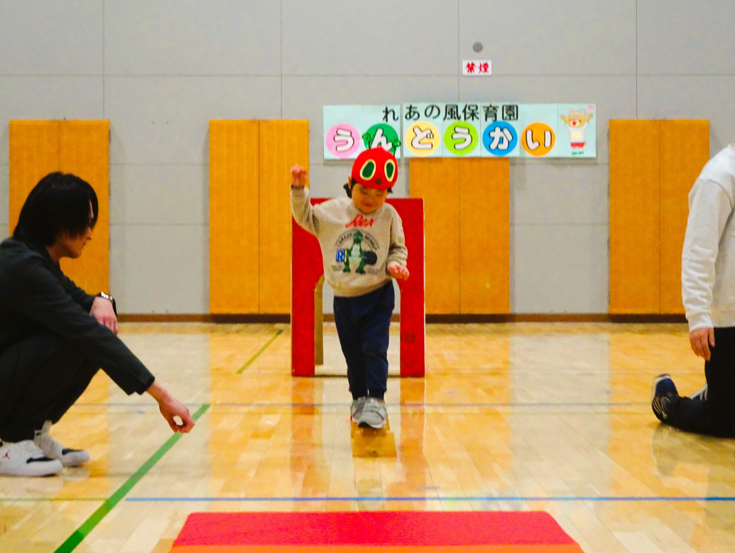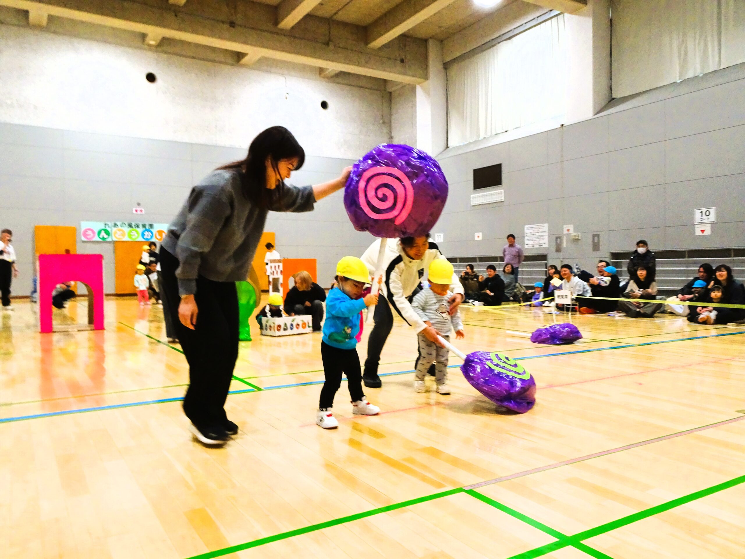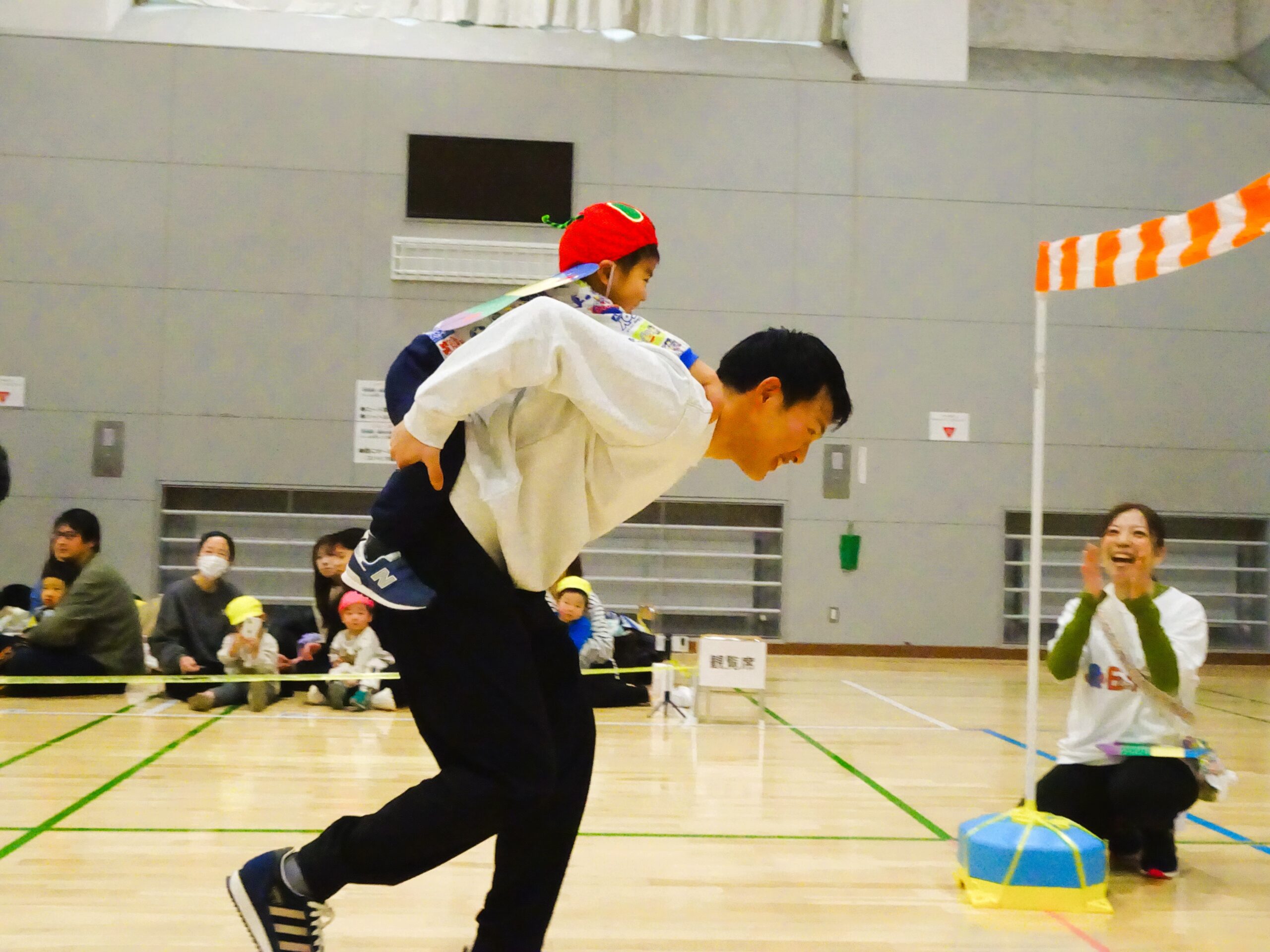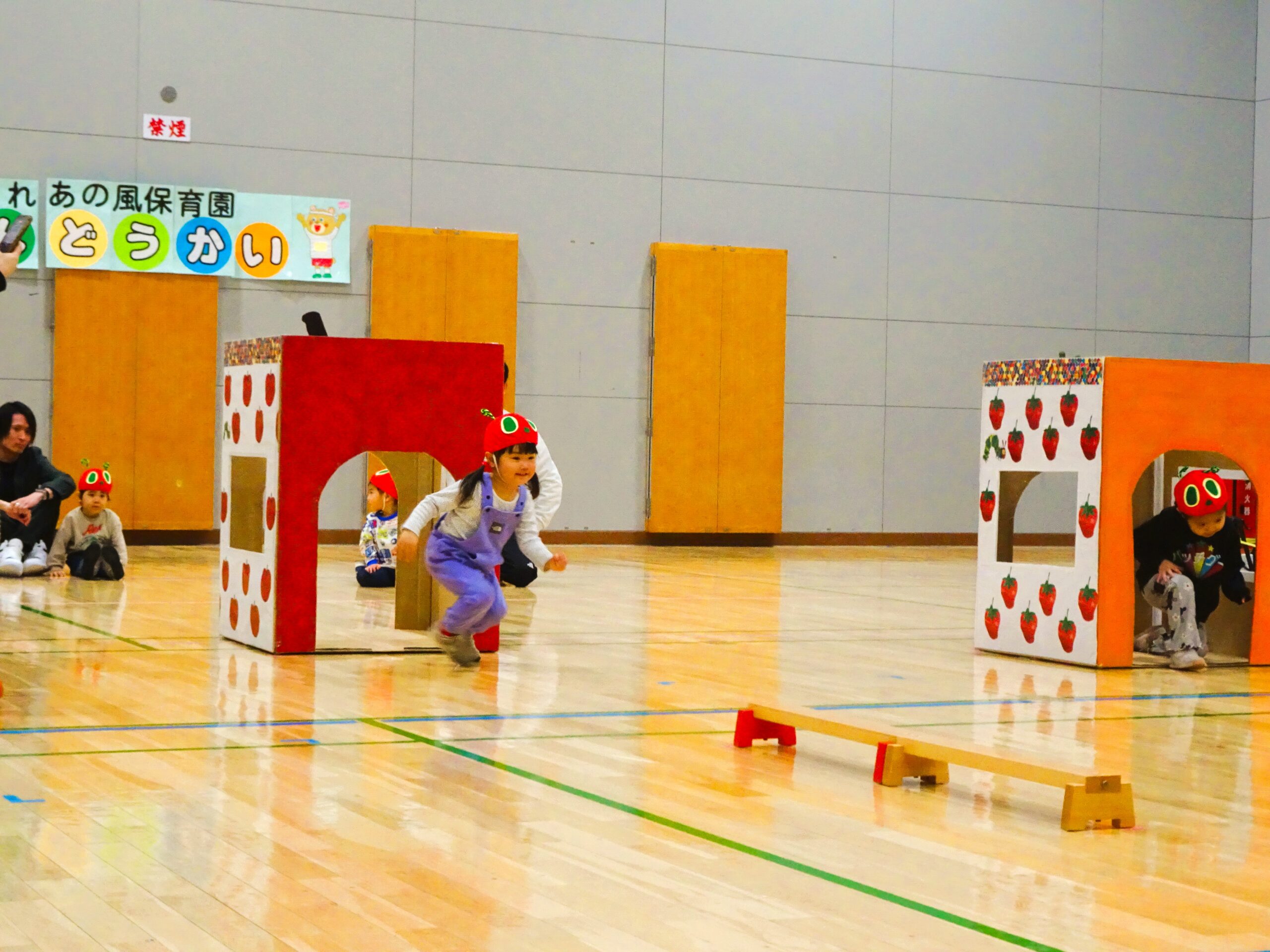 親子競技では、子ども達の大好きな絵本『はらぺこあおむし』の世界を楽しみながら、