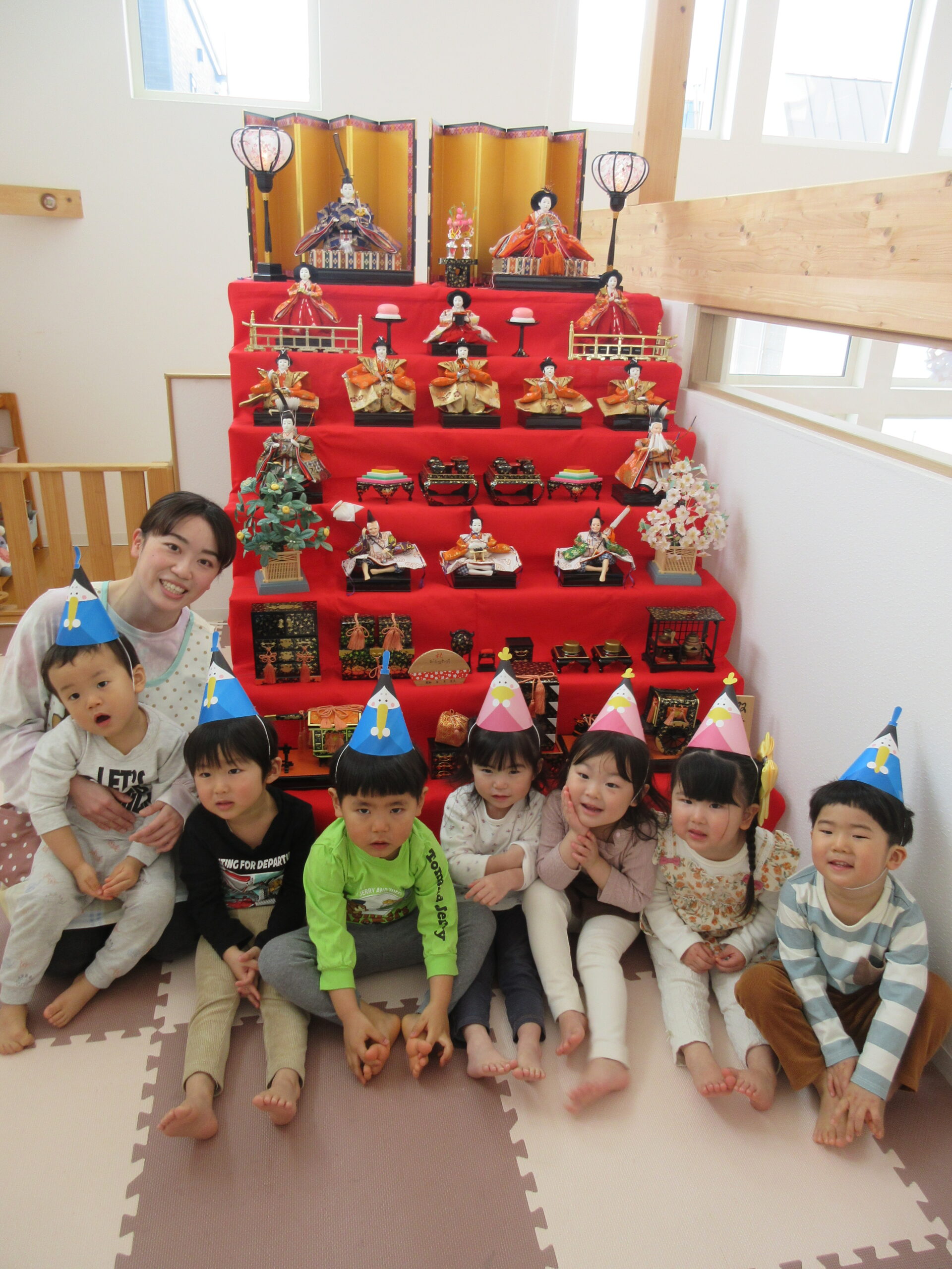 こくあの彩保育園には、地域の方からいただいた7段の雛人形が飾ってあります。今日はぼんぼりに明かりを付けて1日過ごしています🎎子ども達もお雛様とお内裏様を前に記念撮影「カシャ📸✨」