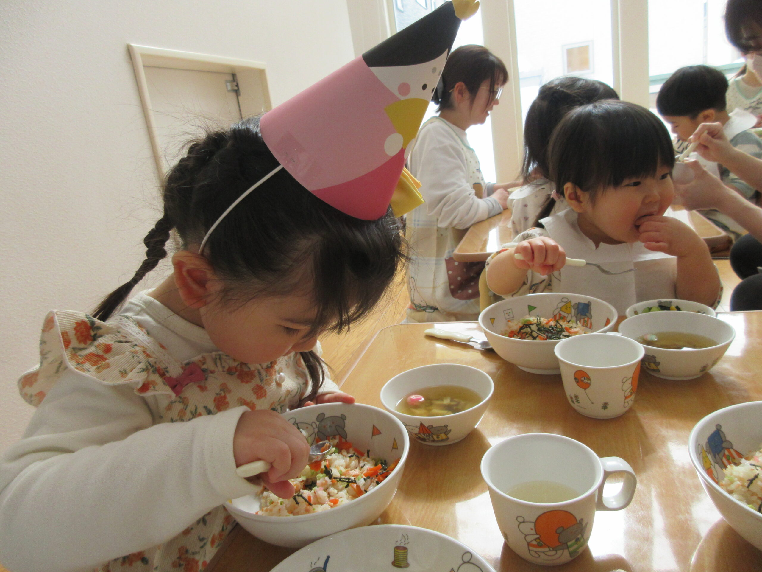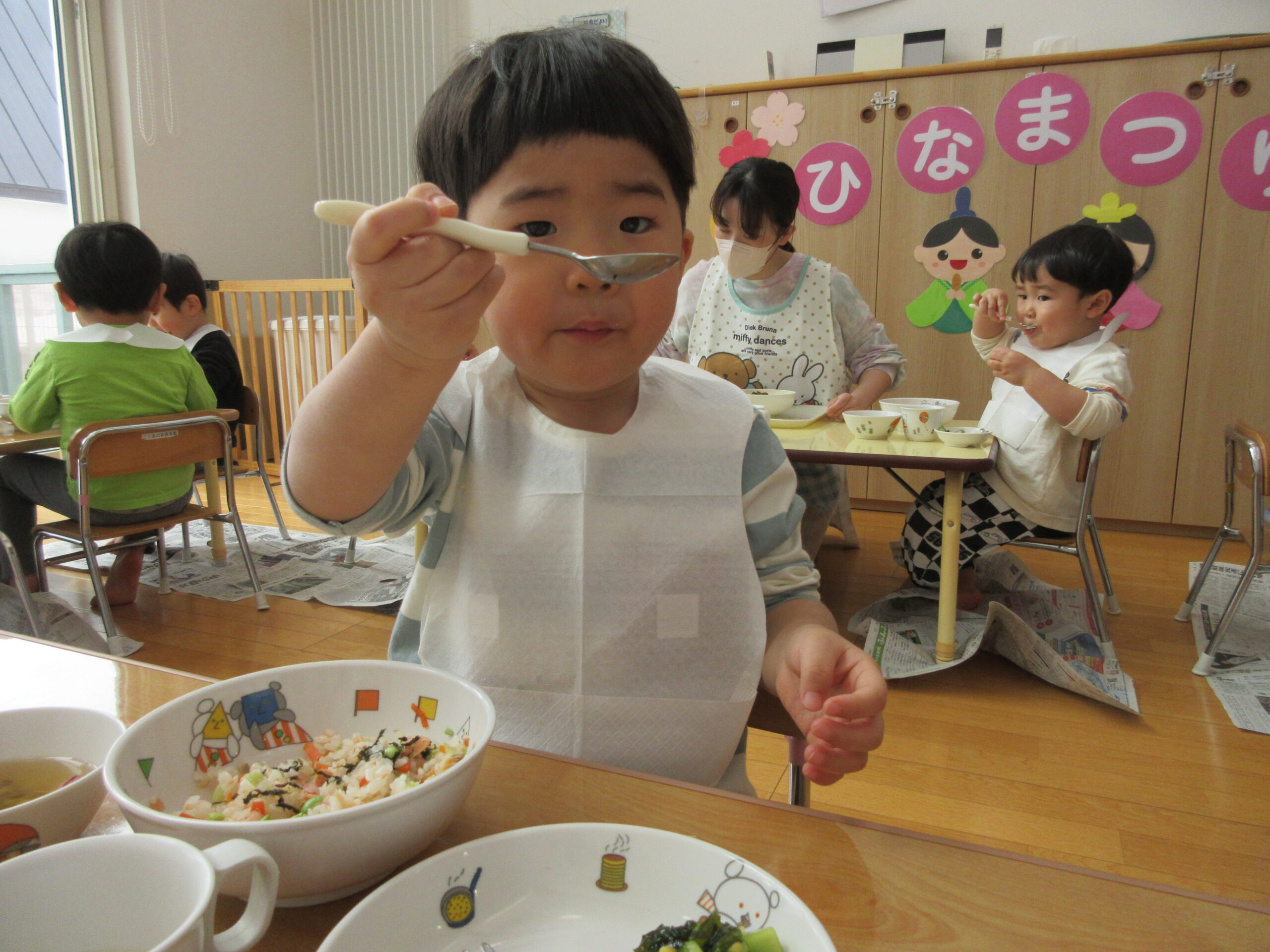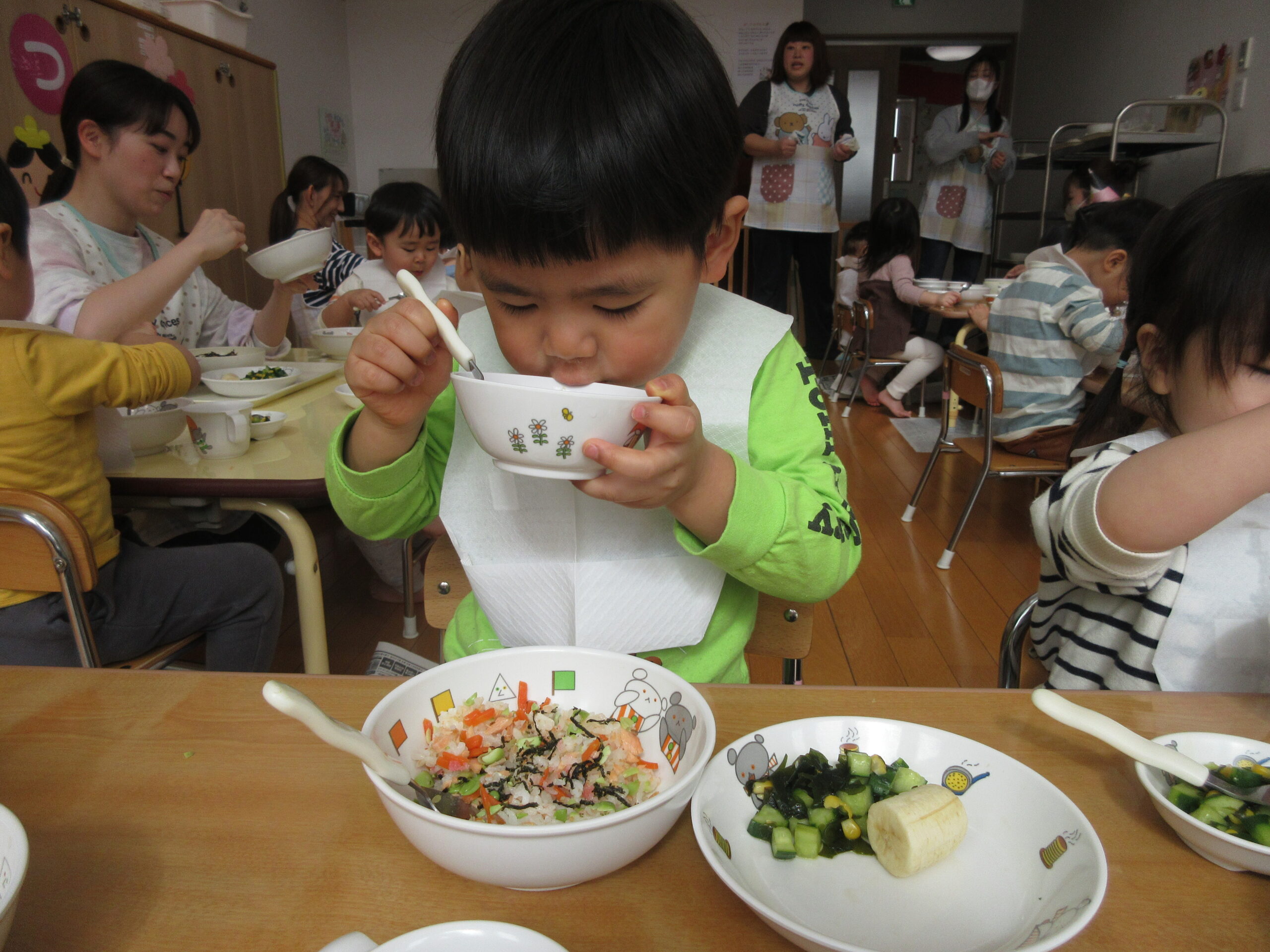 給食は鮭チラシや丸い麩が入っているすまし汁など彩鮮やかなメニュー🌸全クラス合同で食べましたよ😋