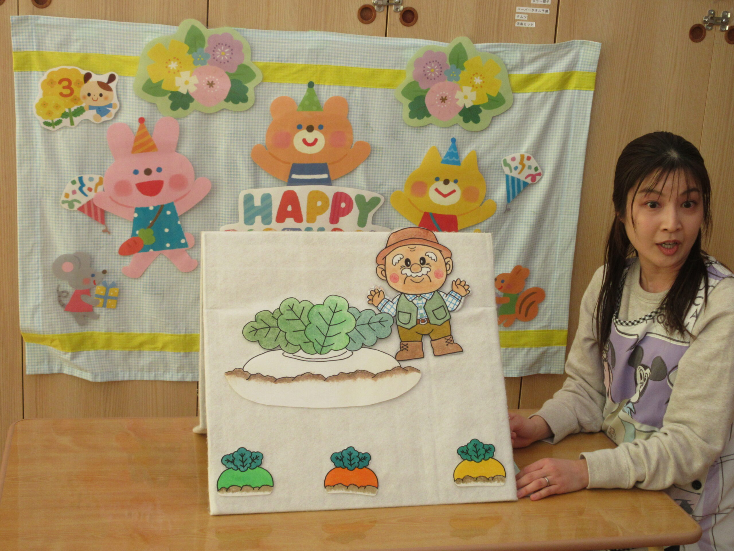先生からの出し物は、今年度のお楽しみ会でも作品を楽しんだ「おおきなかぶ」のお話。