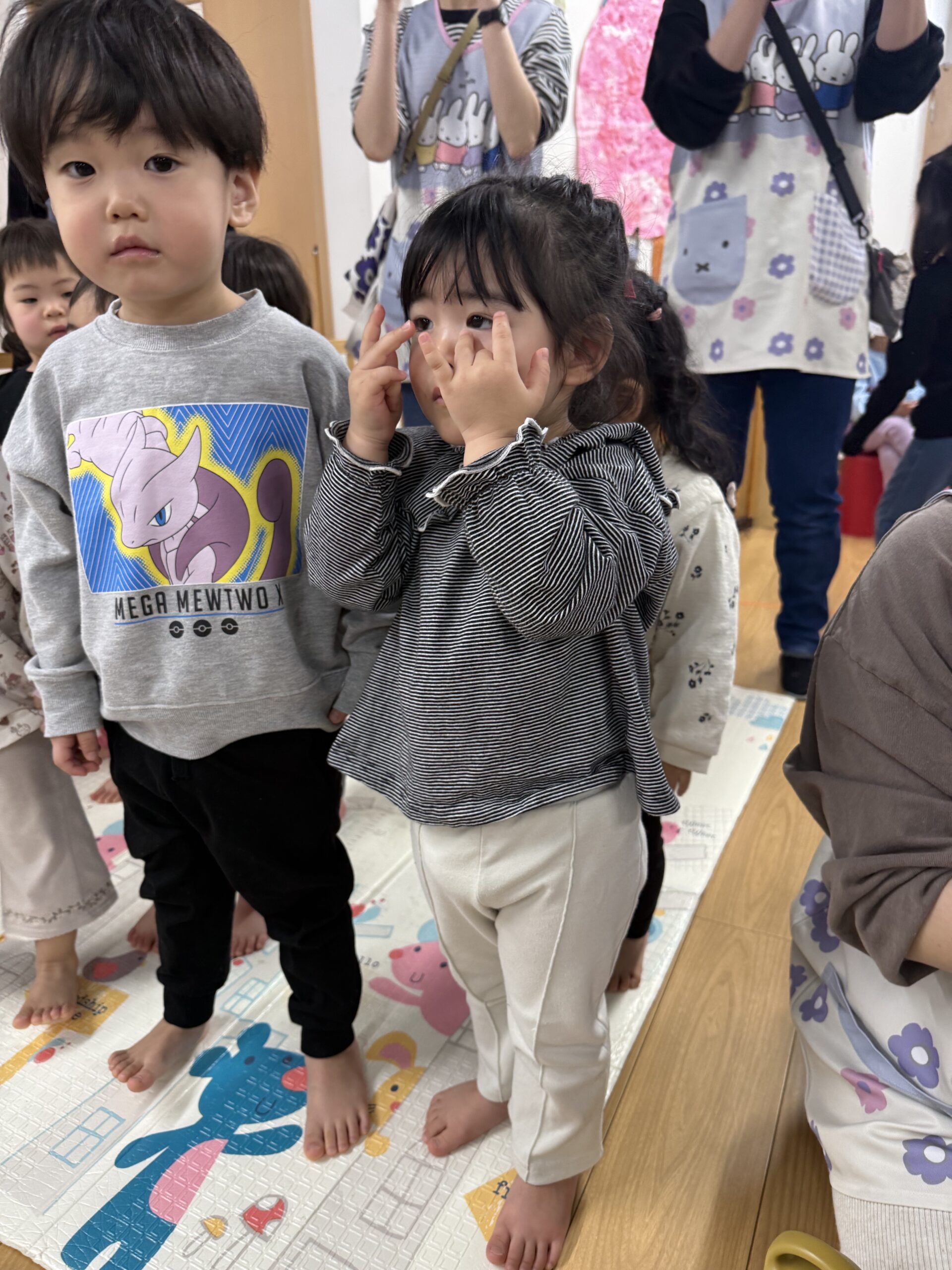 そのあとも、ぶどう組が運動会のバルーンで踊った曲「学園天国」や、めろん組発表会での合奏曲「リメンバーミー」も聴くことができ、大喜びでした。